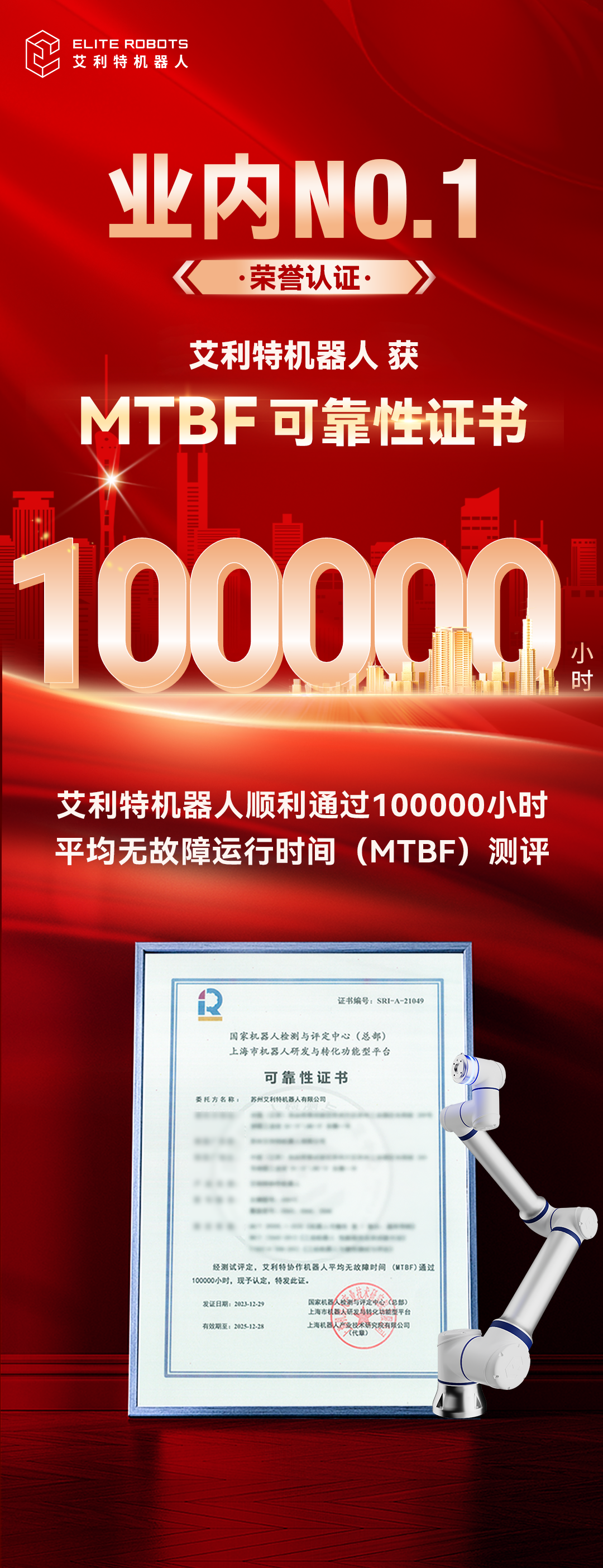 業內首家!艾利特機器人通過MTBF 10萬小時認證,協作機器人可靠性攀頂新臺階!