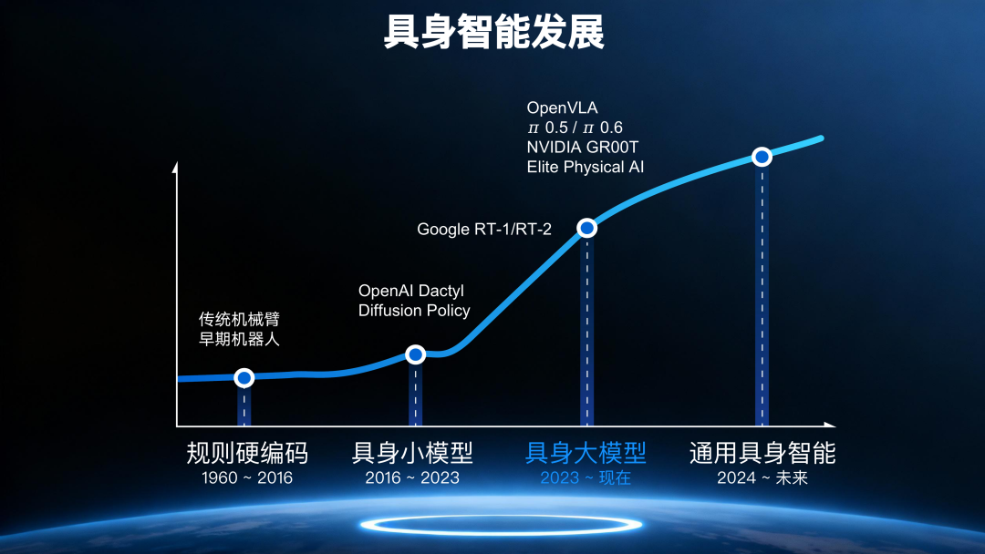 機器人技術的發展經歷了漫長而艱辛的進化之路,早期依賴大量規則硬編碼與預設程序實現控制,靈活性有限,僅適用于高度標準化、重復性強的環境。隨著市場上各類研究的涌現,進入了具身小模型階段,但這些模型高度綁定特定場景,難以實現跨場景泛化與能力遷移。隨后VLA技術的突破開啟了具身大模型新階段,工業領域成為主要競技場。