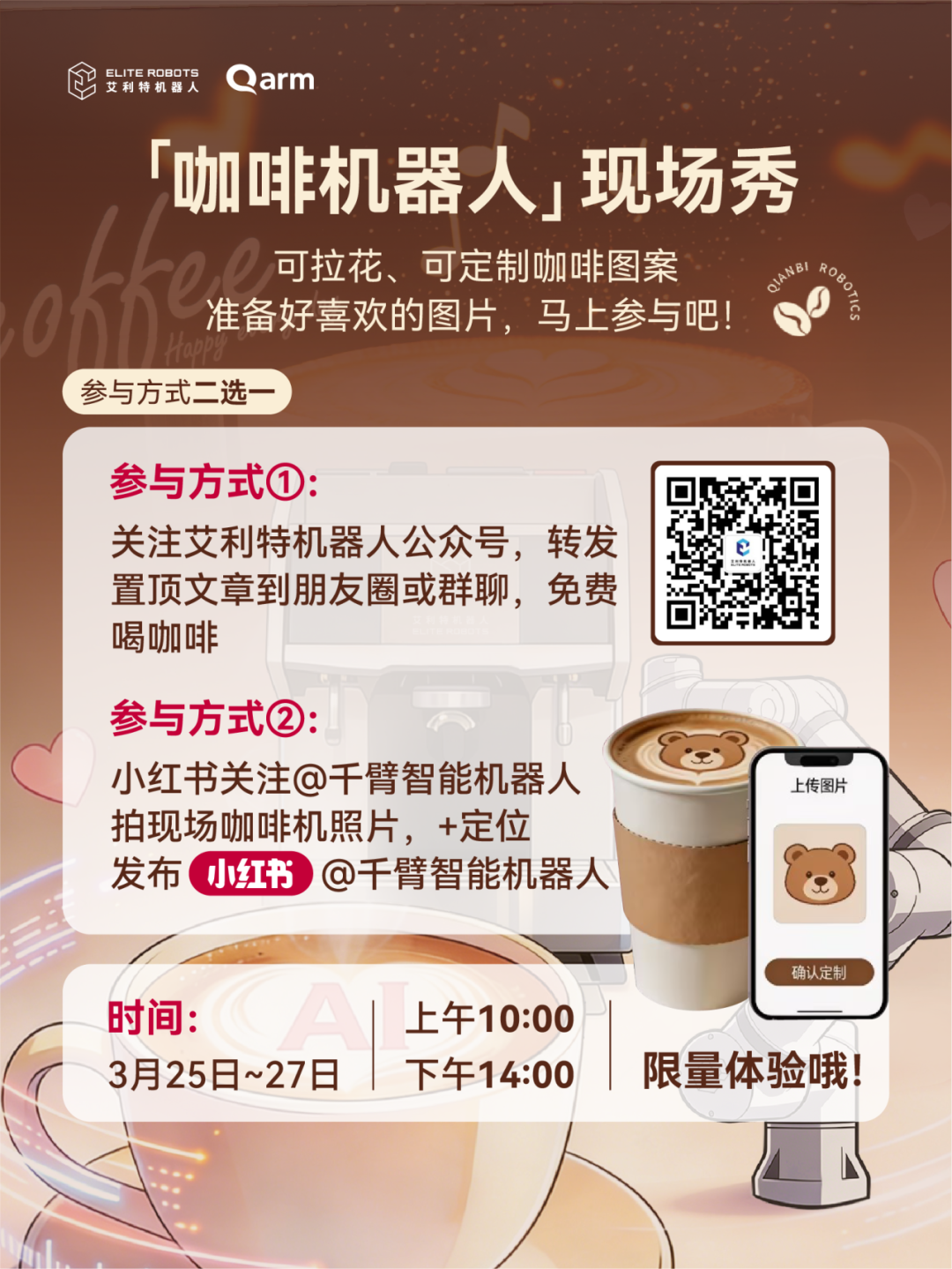 本次展會(huì),艾利特機(jī)器人特別設(shè)置了 【AI咖啡機(jī)器人秀】 ,千臂智能拉花咖啡機(jī)器人現(xiàn)場(chǎng)調(diào)制20+種飲品,50杯/小時(shí)出品,精準(zhǔn)復(fù)刻人工拉花。現(xiàn)場(chǎng)觀眾將有機(jī)會(huì)免費(fèi)領(lǐng)取這杯“具身智能”特調(diào),每日限量100杯,先到先得!