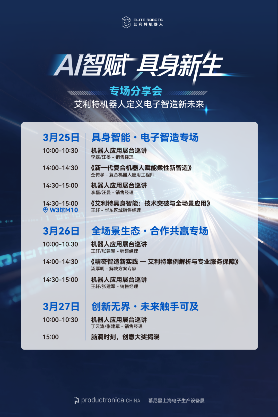 除了看得見的機(jī)器,還有聽得懂的趨勢(shì)。展會(huì)期間,艾利特機(jī)器人將在展位舉行多場(chǎng) 【AI智賦主題演講】 。技術(shù)大咖將圍繞“具身智能如何落地電子智造”等話題,拆解技術(shù)壁壘,分享落地案例。精彩議程詳見海報(bào),歡迎蒞臨交流!
