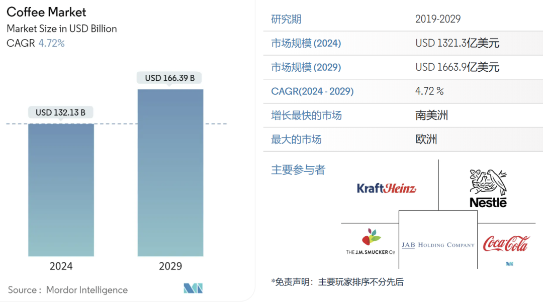 據Mordor Intelligence數據顯示,2024年咖啡市場規模預計為1321.3億美元,預計到2029年將達到1663.9億美元,在預測期內(2024-2029年)復合年增長率為4.72%。同時還提到技術創新、安全措施和機器食品加工設備將在未來幾年對咖啡的需求中發揮重要作用。