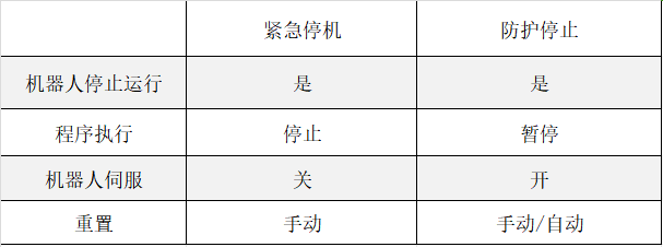 其中緊急停止和防護停止都可以使機器人停止運動,不同的是緊急停止會使機器人掉電下伺服,但防護停止不會。具體差異見下表。