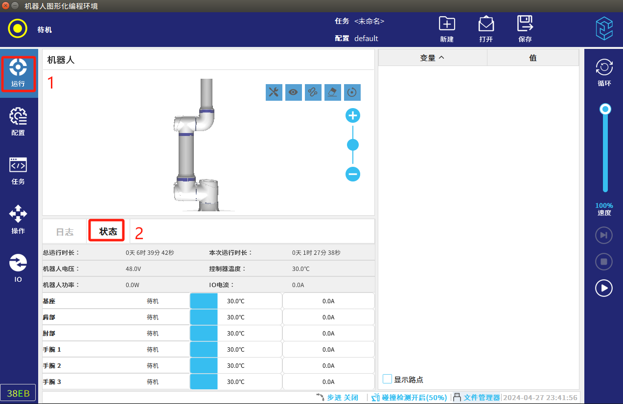 ● 機器人顯示”待機“狀態后退出,進入運行頁面,切換狀態