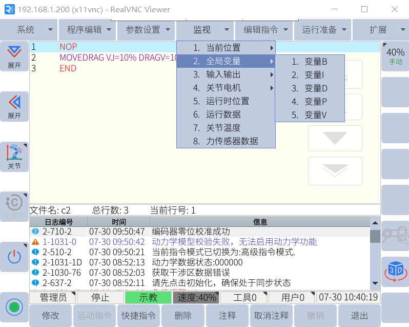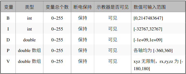 如表格所示,艾利特機(jī)器人全局變量分為五種均可通過 jbi 和 lua 進(jìn)行操作,通常使用情況下,會(huì)使用 B、I、D 變量進(jìn)行 邏輯的交互和簡(jiǎn)單數(shù)據(jù)的傳遞,而 P 變量用作放置關(guān)節(jié)數(shù)據(jù),V 變量用作放置笛卡爾數(shù)據(jù)。 P 變量和 V 變量存放對(duì)應(yīng)的數(shù)據(jù)后,可以使用示教器手動(dòng)移動(dòng)到目標(biāo)位置,或者通過移動(dòng)指令 直接到指定的位置。