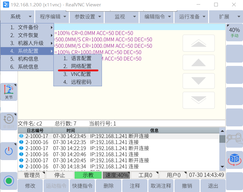 VNC是一款優(yōu)秀的遠程控制工具,Elite_EC系列機器人內(nèi)部已經(jīng)集成VNC服務(wù)器,用戶可以通過網(wǎng)線鏈接即可在電腦上進行查看、控制機器人的示教器界面。