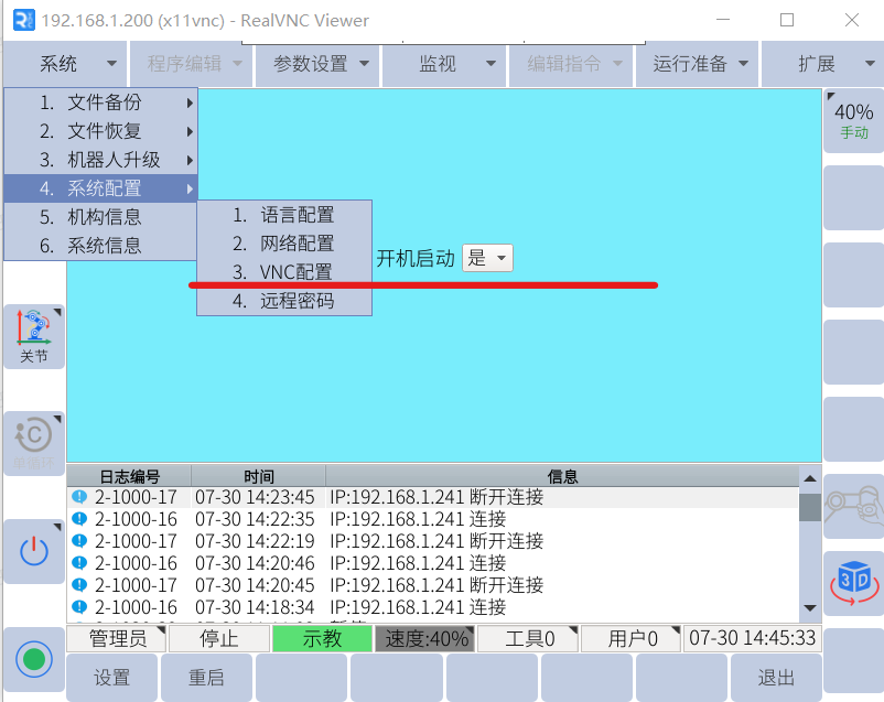 3. 機器人側(cè)在系統(tǒng)配置-VNC配置中,修改為開機啟動并設(shè)置,同時點擊啟動按鍵,當(dāng)示教器窗口出現(xiàn)VNC已啟動和VNC設(shè)置成功后即可。