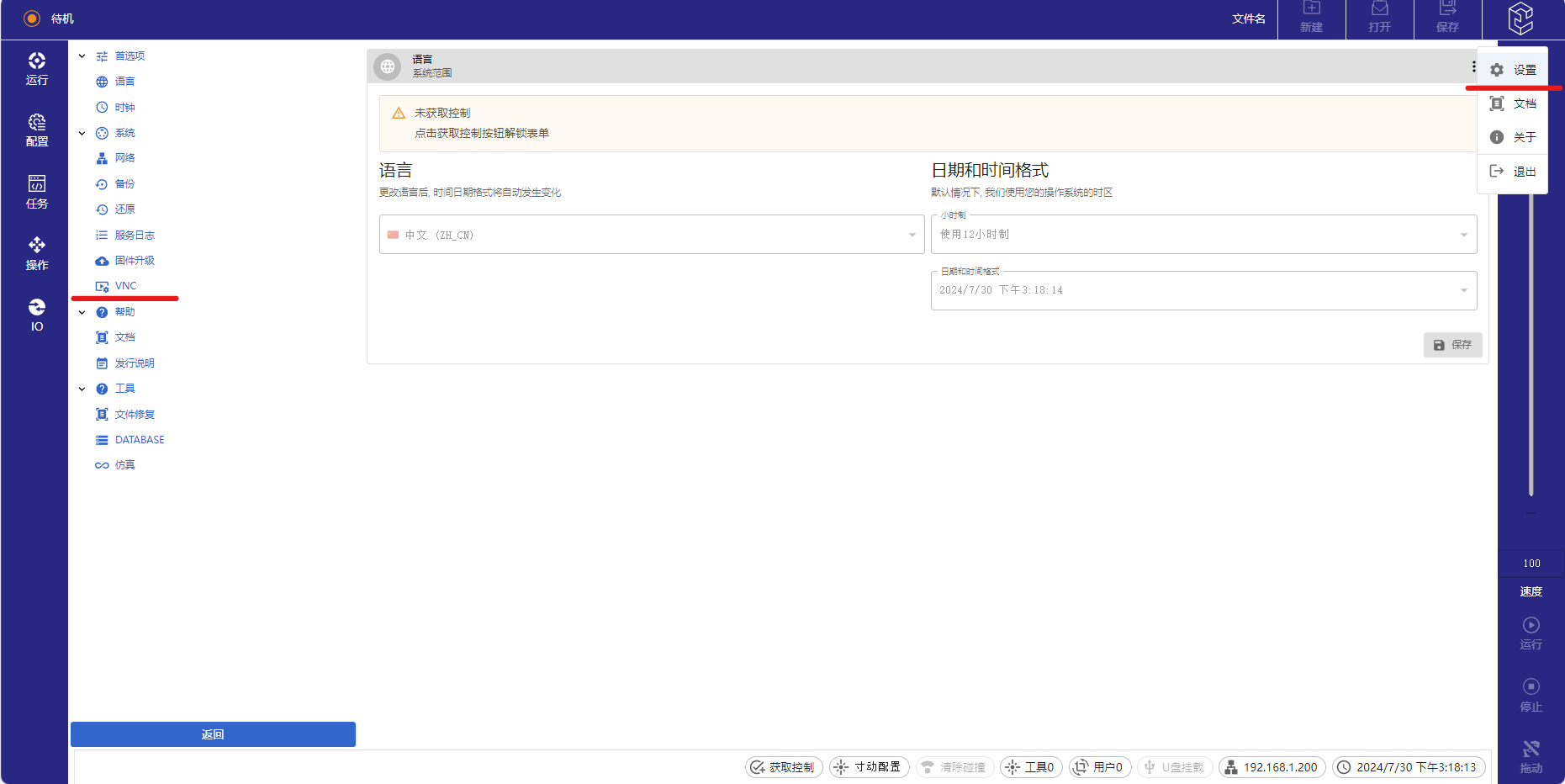 3.12及以上版本開始支持全新的網(wǎng)頁示教器,其功能更豐富,若還想在網(wǎng)頁示教器使用VNC功能按照如下步驟: 先點擊右上角艾利特logo,點擊設(shè)置,再點擊VNC即可進入