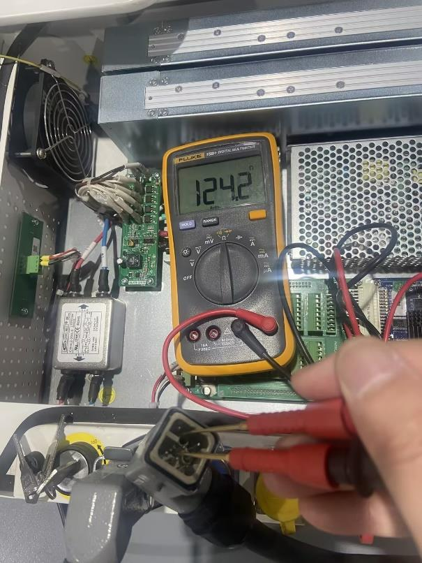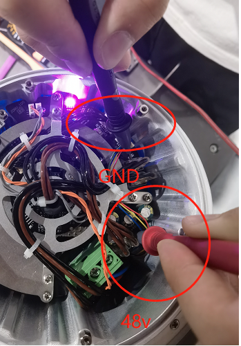 6. 拆開端蓋檢查1軸驅動板上指示燈是否正常亮起和測量電壓是否正常48v。如電壓不正常可能是電源線纜或驅動板電源芯片故障導致無法正常供電。棕線端子是48V,黑線端子是GND。