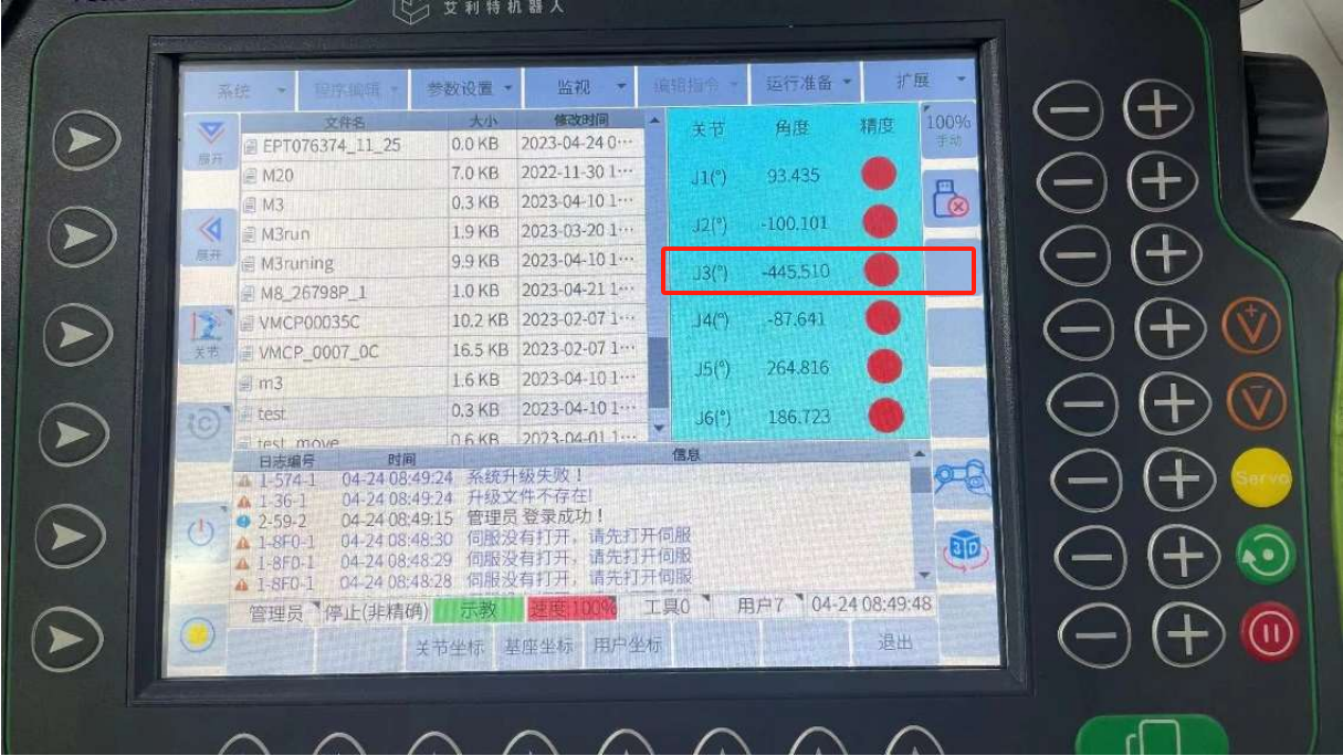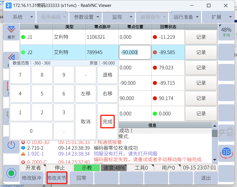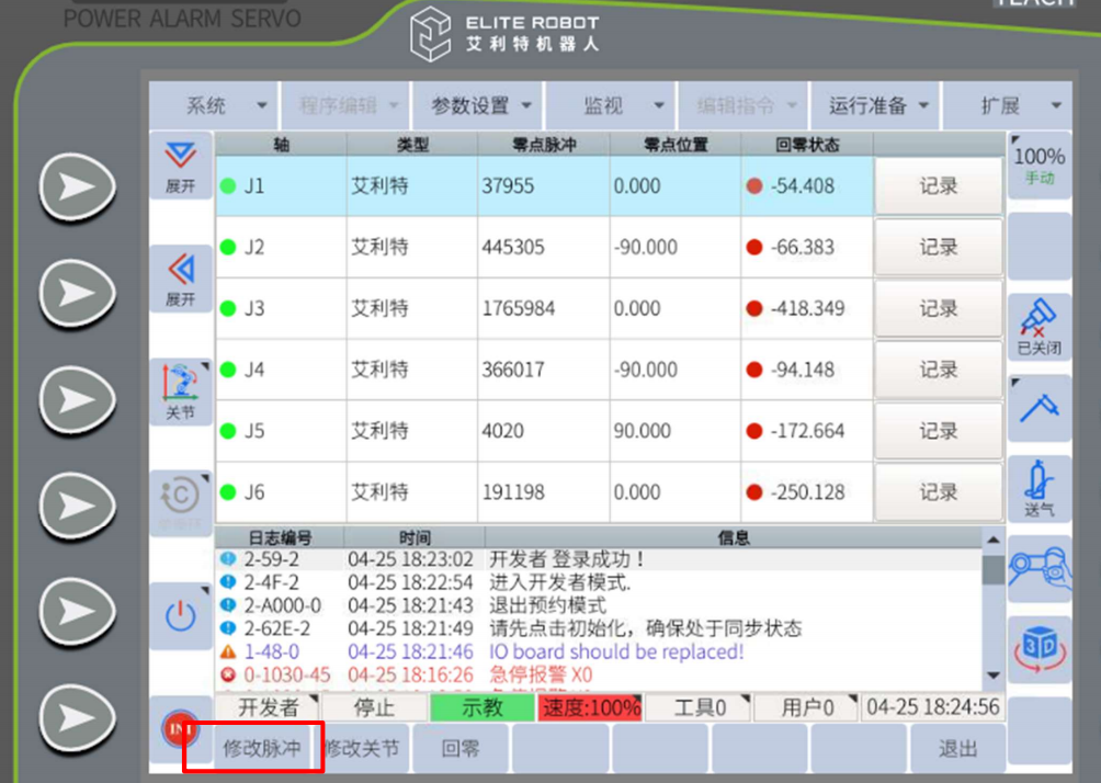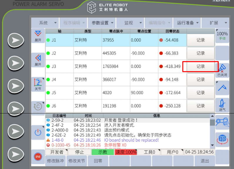 先用手機對零點界面拍照,把六個關節的零點脈沖都拍照記錄下來。然后在示教器上對套圈超限關節點擊:記錄。這時該關節角度會變成零點位置的角度,且該關節的零點脈沖值會改變,機器人可以手動運行。