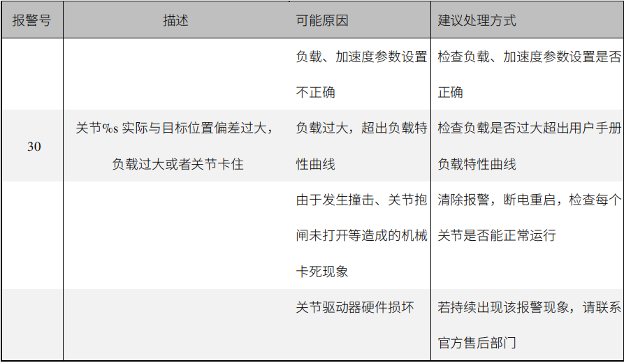 報警代碼:伺服故障碼:30,關節3實際與目標位置偏差過大,負載過大或者關節卡住
