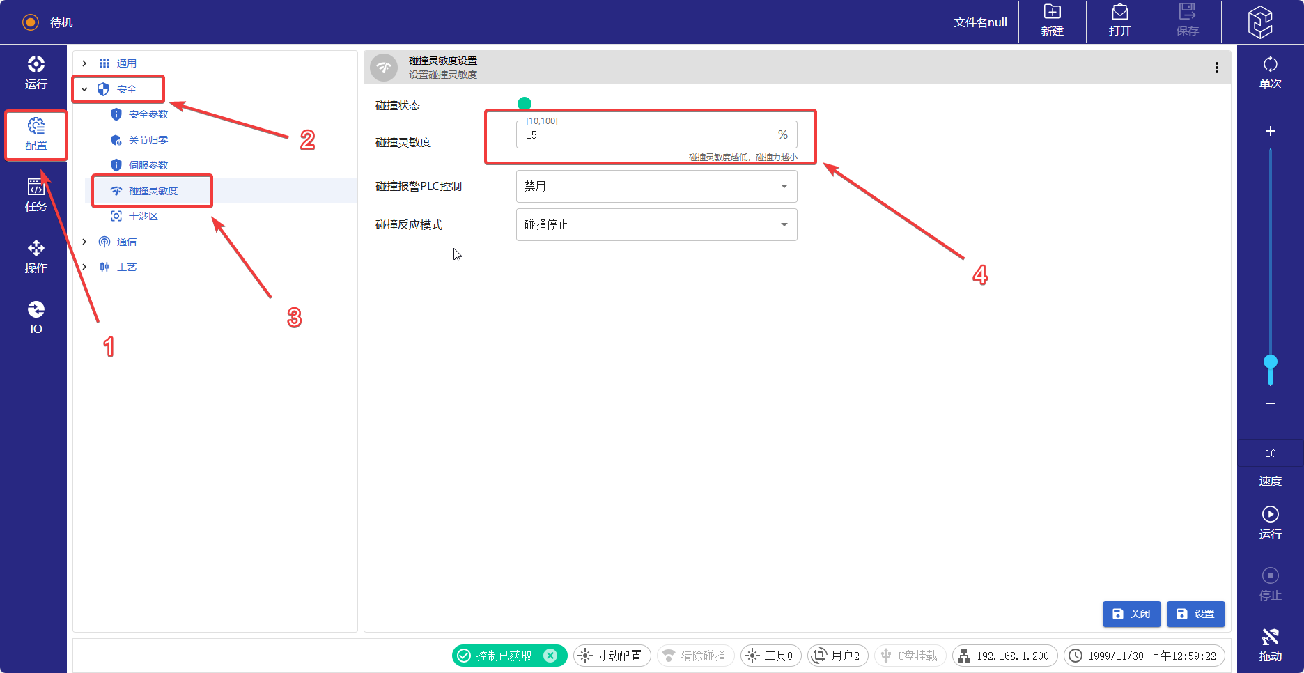 tips:機器人開啟碰撞檢測后,靈敏度設置的越小,代表機器人越靈敏,觸發機器人“碰撞檢測報警”所需要的力便越小。