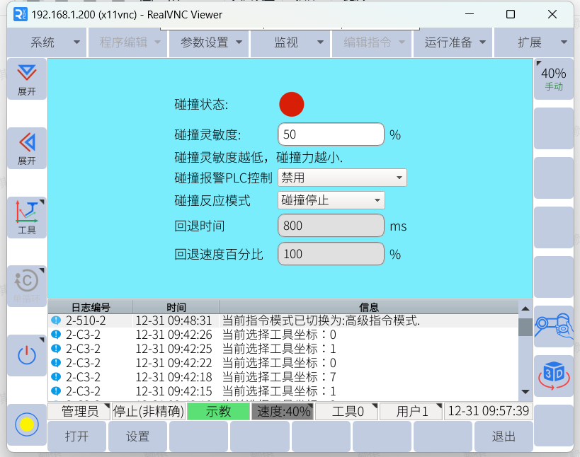 6. 設置碰撞檢測靈敏度,運行準備—安裝配置—碰撞檢測,如碰撞狀態(tài)是紅色,可點擊左下角“打開“啟動碰撞功能。