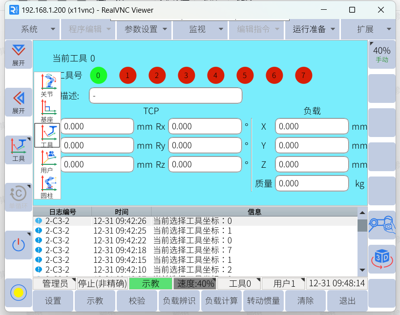 ● 確認機器人未裝配負載,并點擊“運行準備 > 工具負載設置”,確保負載參數(shù)為 0