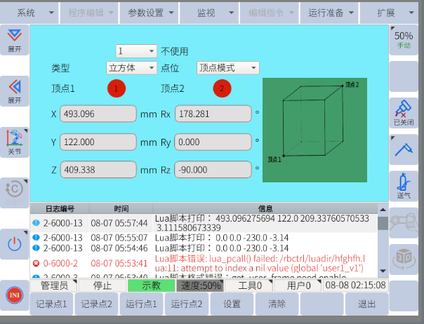 本文舉例以工具末端始終垂直于地面,現場作業過程中,機器人末端可能存在多種姿態,需要依照現場作業環境做出實時更改,切不可完全參照本文舉例。比如現場機器人存在末端RX或RY較對齊姿態旋轉了90°,上升時可能會存在末端干涉問題。