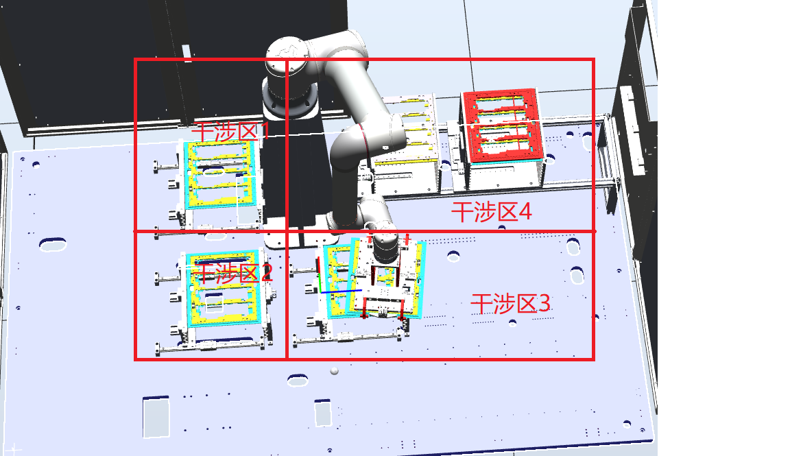 以下圖為例,將工作區域分為四個干涉區,以下圖機器人位置為Home點,會在四個干涉區中進行產品的取放,最終作業結束后會回到Home點。