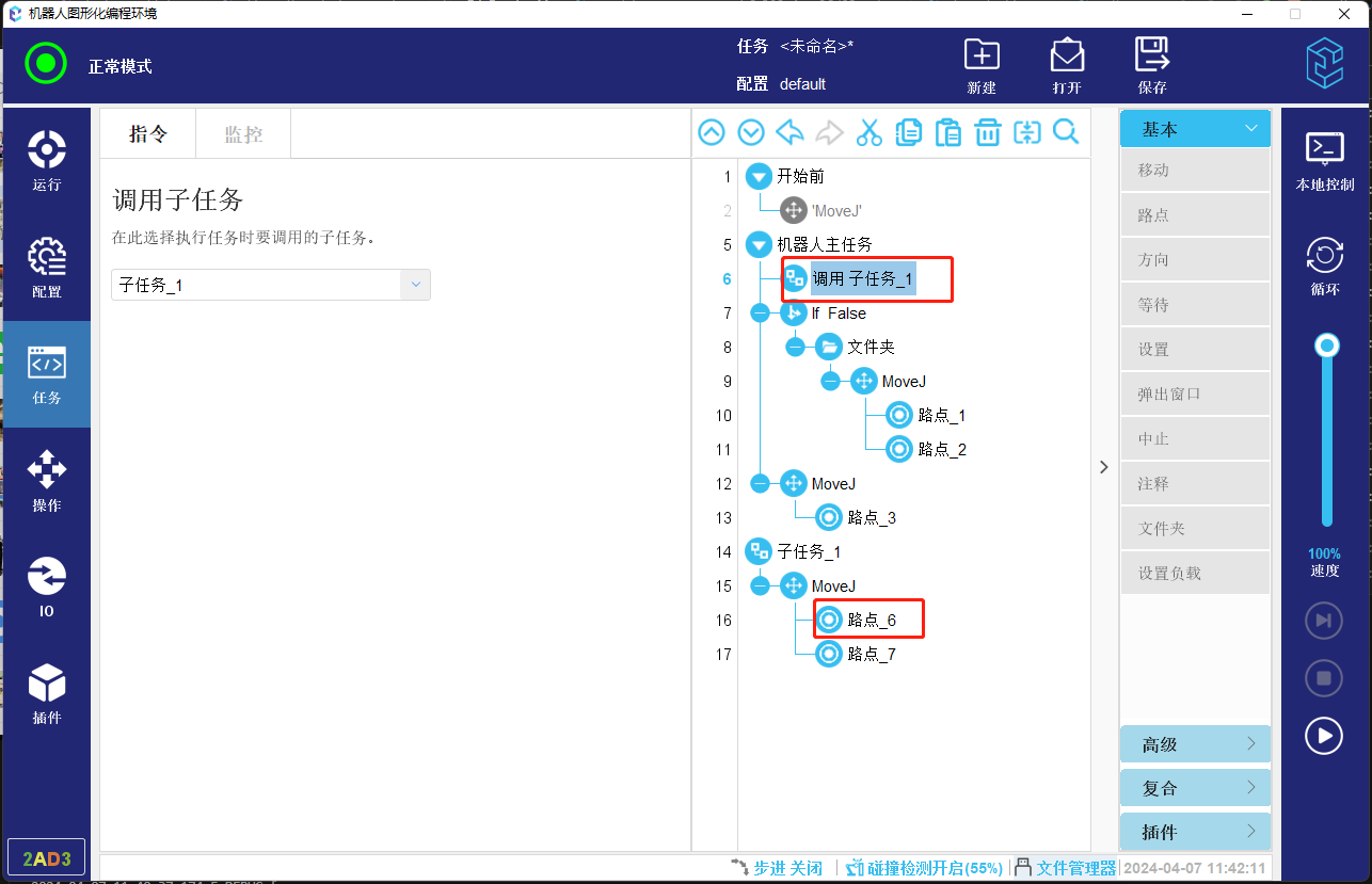 4. 如果程序流程中,存在調用子任務節點,則會進入被調用的子任務內部按照相應規則,查找起始安全位置點位,如圖-5所示程序,如果任務從第一行開始運行,則會查找到路點_6作為程序起始位置。