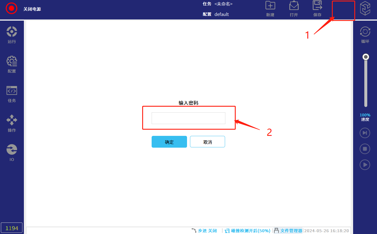 - 在正常模式下點擊下圖所示右上角紅框1標注區域(連續快速點擊 5-8 次)就會出現輸入密碼頁面界,紅框2點擊輸入密碼:elibot,進入專家模式;