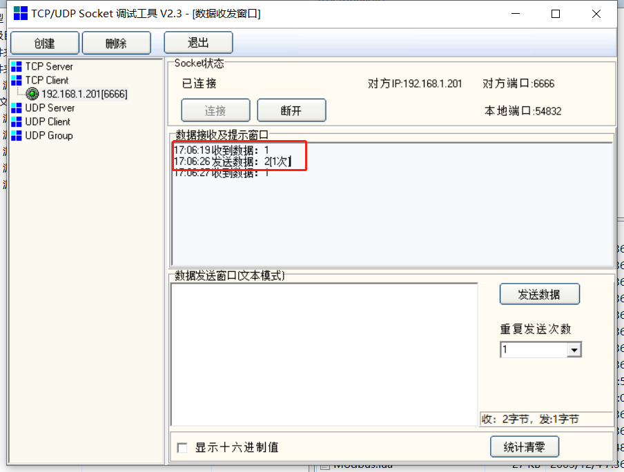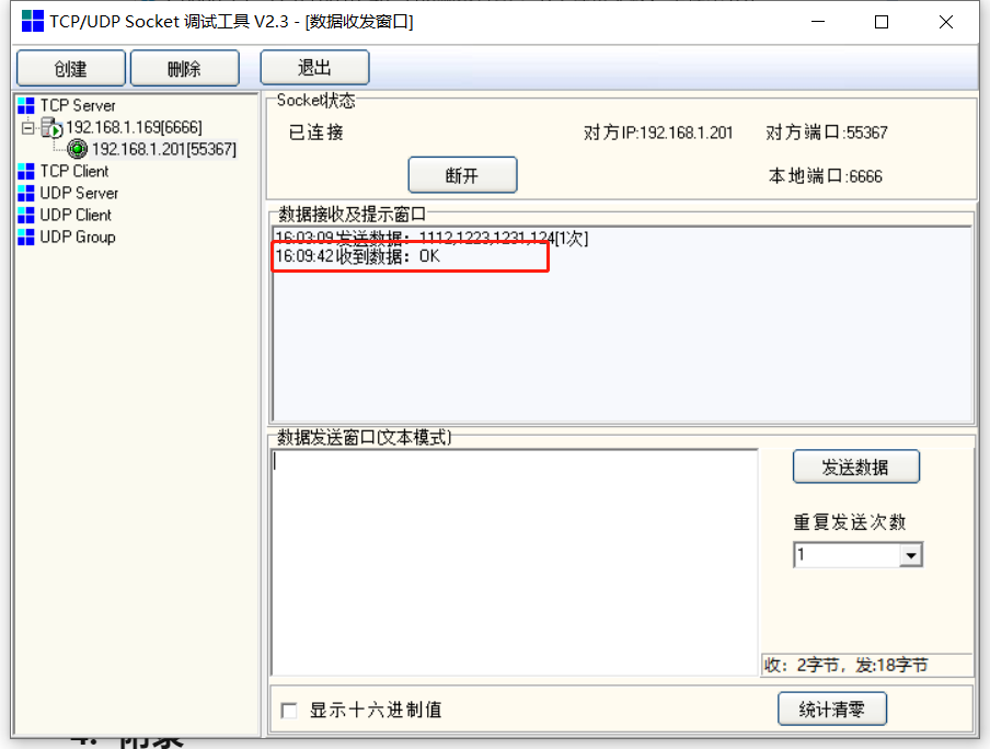連接上后,機器人會發送字符串“1”給客戶端,通訊助手上接收到數據