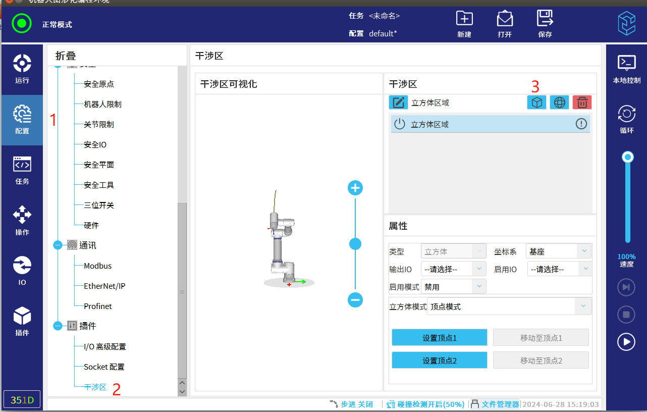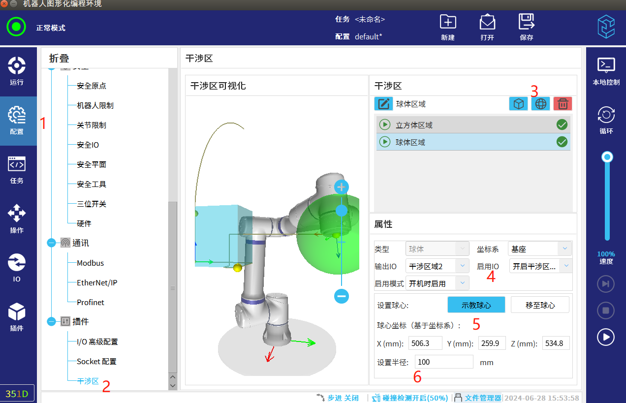 如圖2-4 配置-干涉區-添加球形干涉區 -綁定DIDO-示教球心-設置球半徑