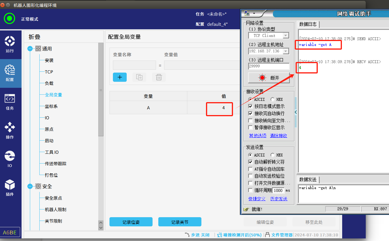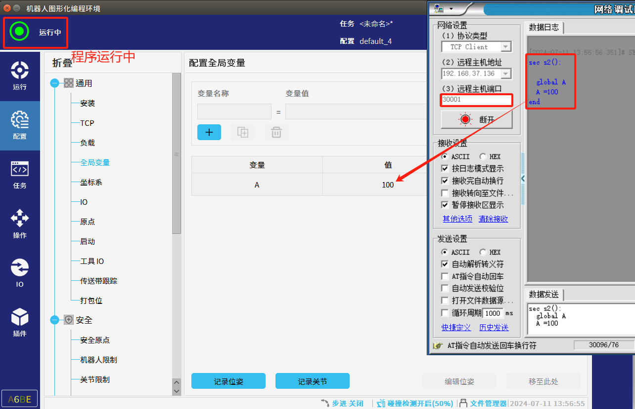 2. 使用30001端口修改全局變量時,需要定先義一個與機器人端名稱一模一樣的全局變量。