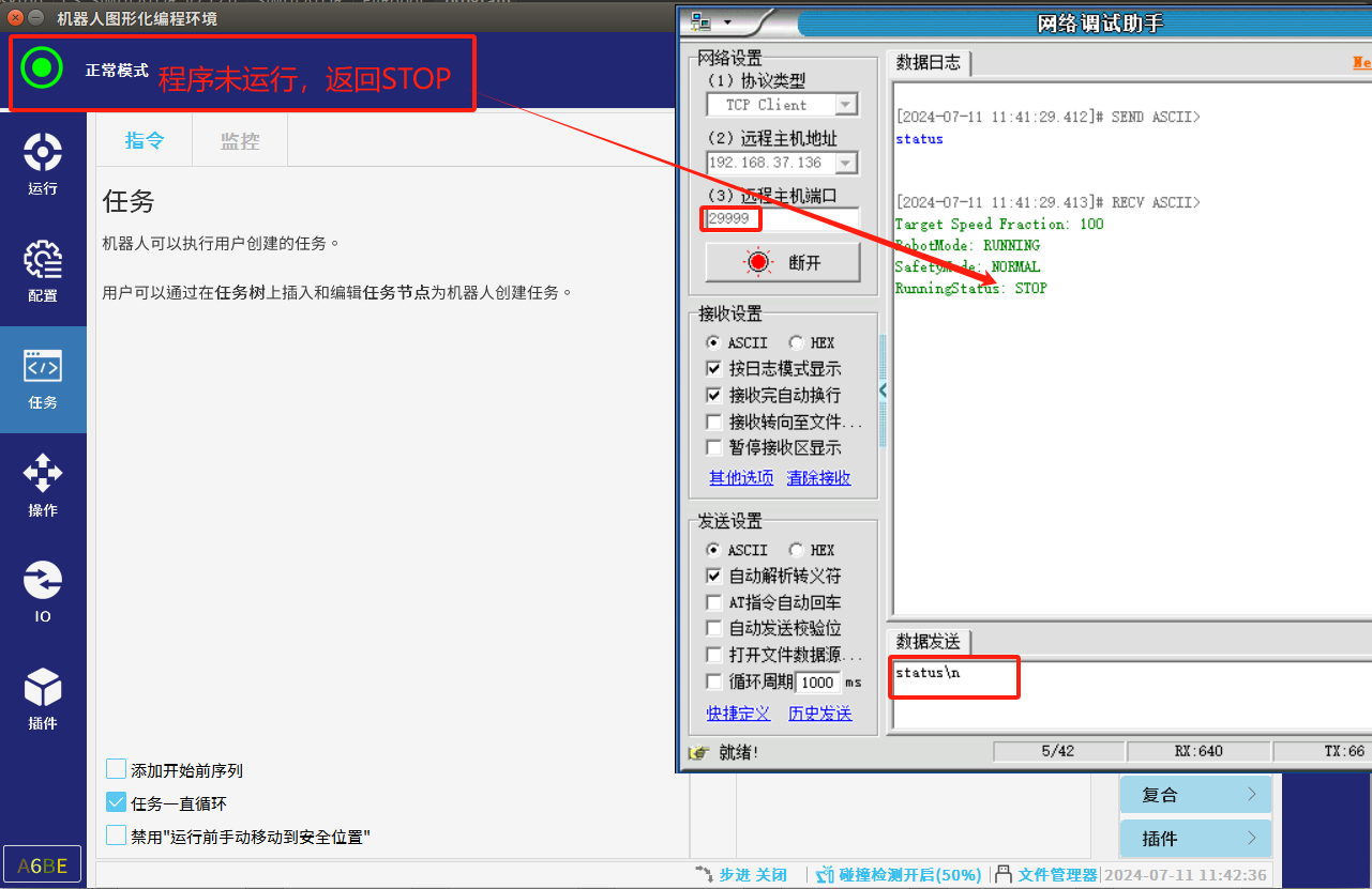 因為當我們想修改全局變量時機器人處于非運行狀態時需要用到29999端口對全局變量進行修改,機器人處于運行狀態時需要用到30001端口對全局變量修改,所以建議在修改全局變量前判斷機器人是否為運行狀態,可以通過29999端口,發送status\n獲取機器人當前程序狀態,需注意的是 dashboard shell 命令默認需以“\n”作為結束輸入標識符,因此在發送命令時要以“\n”結 尾,否則將被認為未完成輸入,不會被響應。