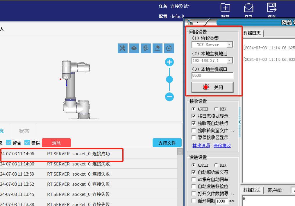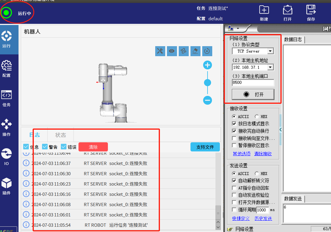 2.為了避免圖1-1的情況發生我們可以利用socket_open()建立 TCP/IP 網絡通信時的返回值做條件判斷循環連接直到連接成功后程序才繼續往下運行。如圖1-2所示如果服務器未打開時機器人會一直與服務器建立連接并打印“連接失敗”到EliRobot 的日志欄中。