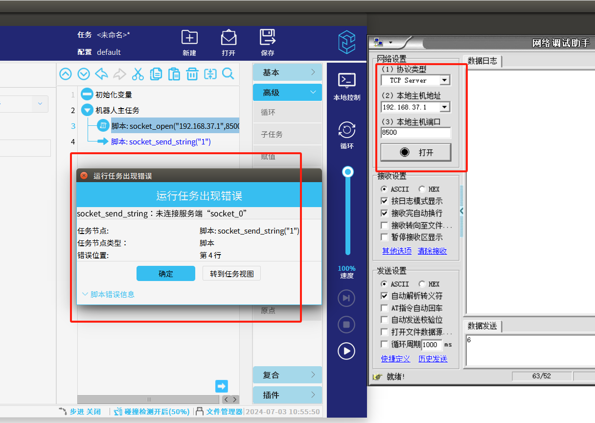 1.當我們單純使用 socket_open()建立 TCP/IP 網絡通信指令時,如果服務器還未打開時,機器人端戶端未連接到服務器,程序依然往下運行,運行到發送/接收時機器人就會報錯如圖1-1所示,這樣機器人就必須初始化重新運行。