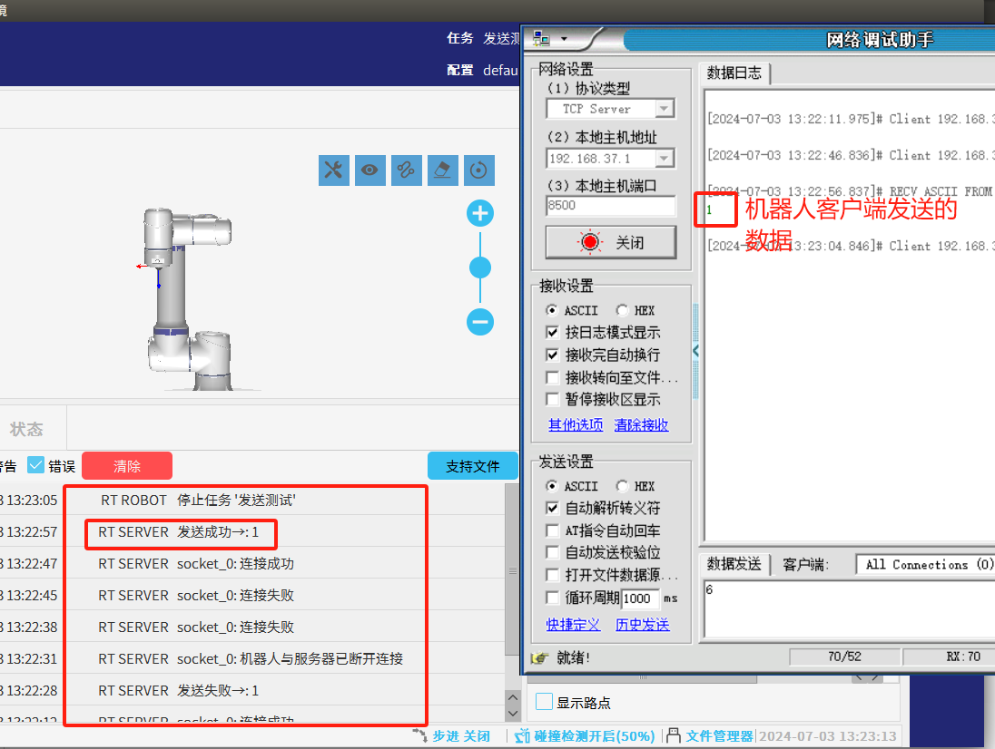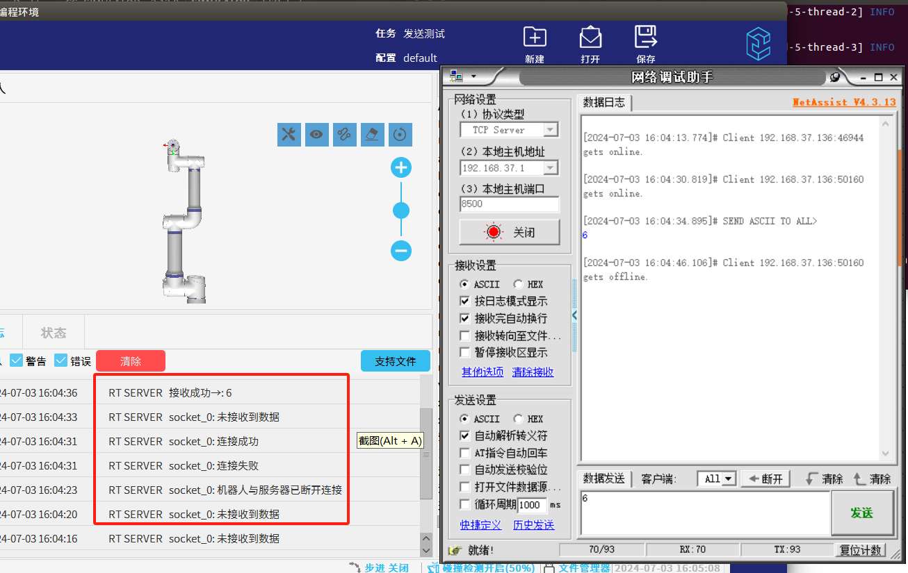 - 以上代碼是以發送字符串和讀取字符串為例,如果想發送/讀取其他數據類型,只需要更換代碼中的socket_send_string/socket_read_string即可,具體指令參考CS機器人腳本手冊下載中心_機器人技術-艾利特機器人