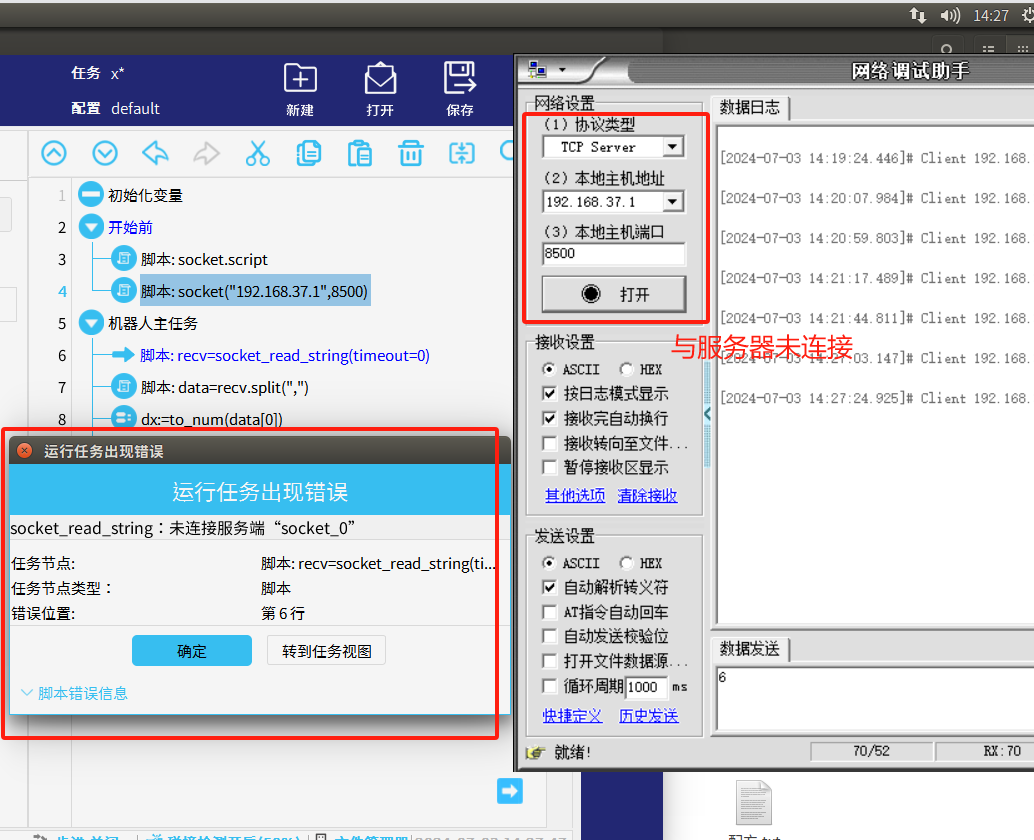 a:如果當機器人與服務器未連接時就接收數據就會如圖3-1所示報錯,此時程序已經停止需要重新初始化程序。