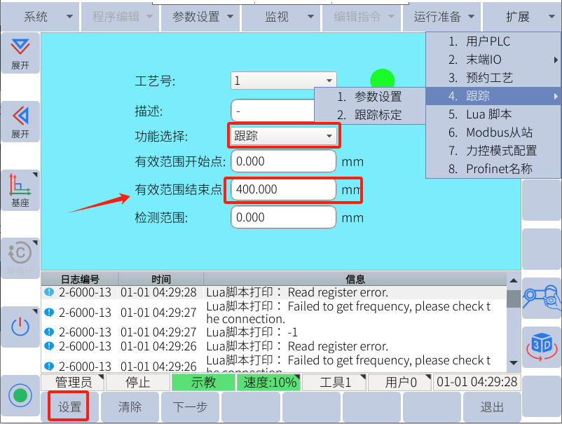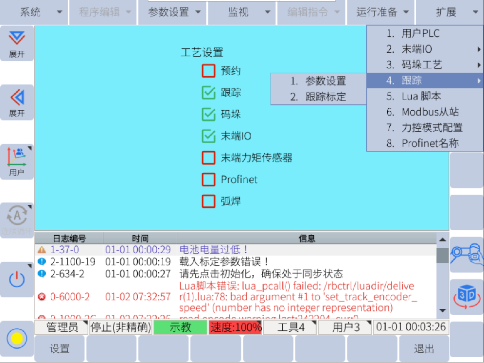 在機器人的 擴展---跟蹤---參數(shù)設(shè)置 中修改需要用到的跟蹤參數(shù)。