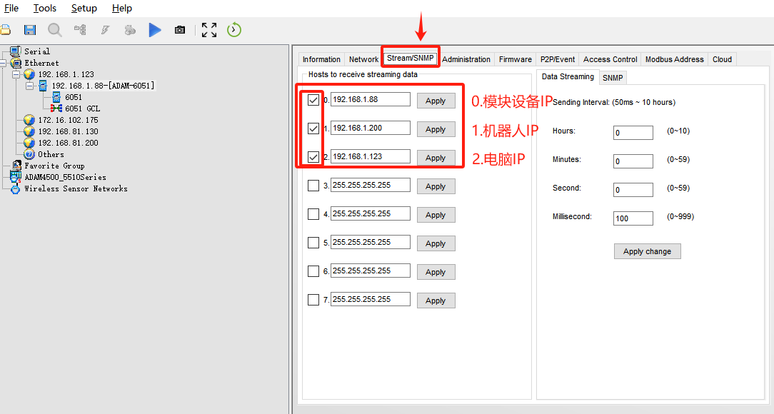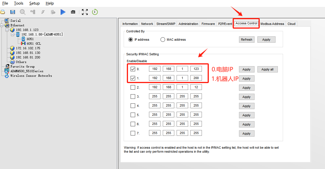 設(shè)置完成后點擊下圖,勾選前面方框,設(shè)置能夠控制模塊的IP地址,設(shè)置完成后點擊Apply。