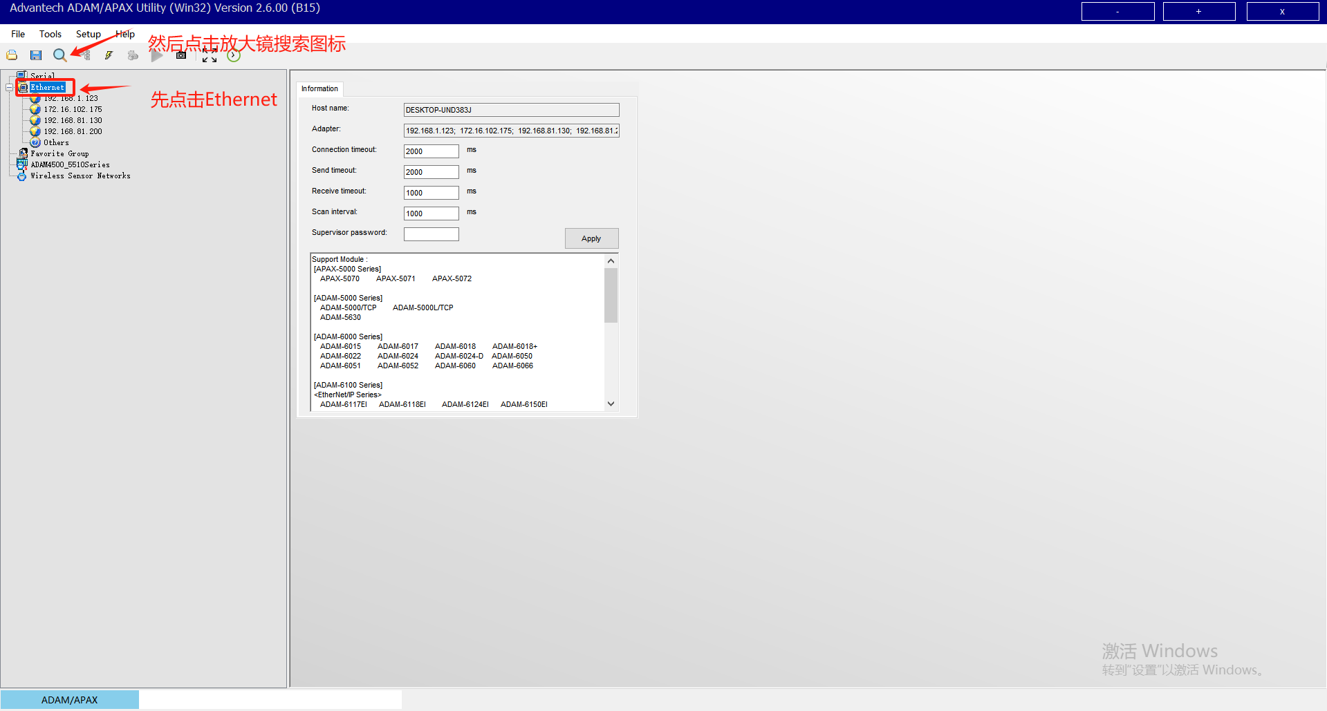 電腦IP與模塊的IP設(shè)置為同一網(wǎng)段,然后打開軟件,按下圖操作開始進行