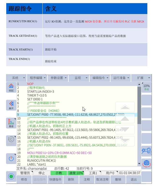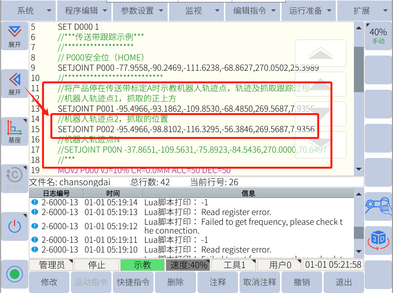 標定步驟:將物品放到傳送帶上緩慢開動傳送帶使物品經(jīng)過傳感器(此時日志窗口顯示“io標定結(jié)束”)到達A點后,停止傳送帶運動,將機械臂移動尖點至A點并記錄A點和程序中的“P002”,此時可以退出標定頁面進入程序示教跟蹤軌跡(示教圖中應(yīng)避免晃動物品)