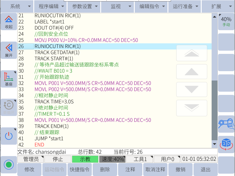 整體標定好后,運行JBI程序,將鑰匙旋鈕轉(zhuǎn)到PLAY模式,速度要放到100%,才能跟上傳送帶速度,然后上伺服,啟動。
