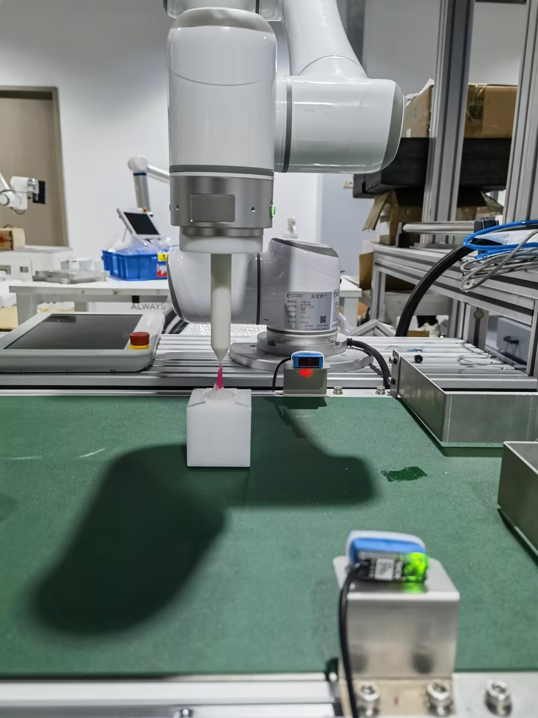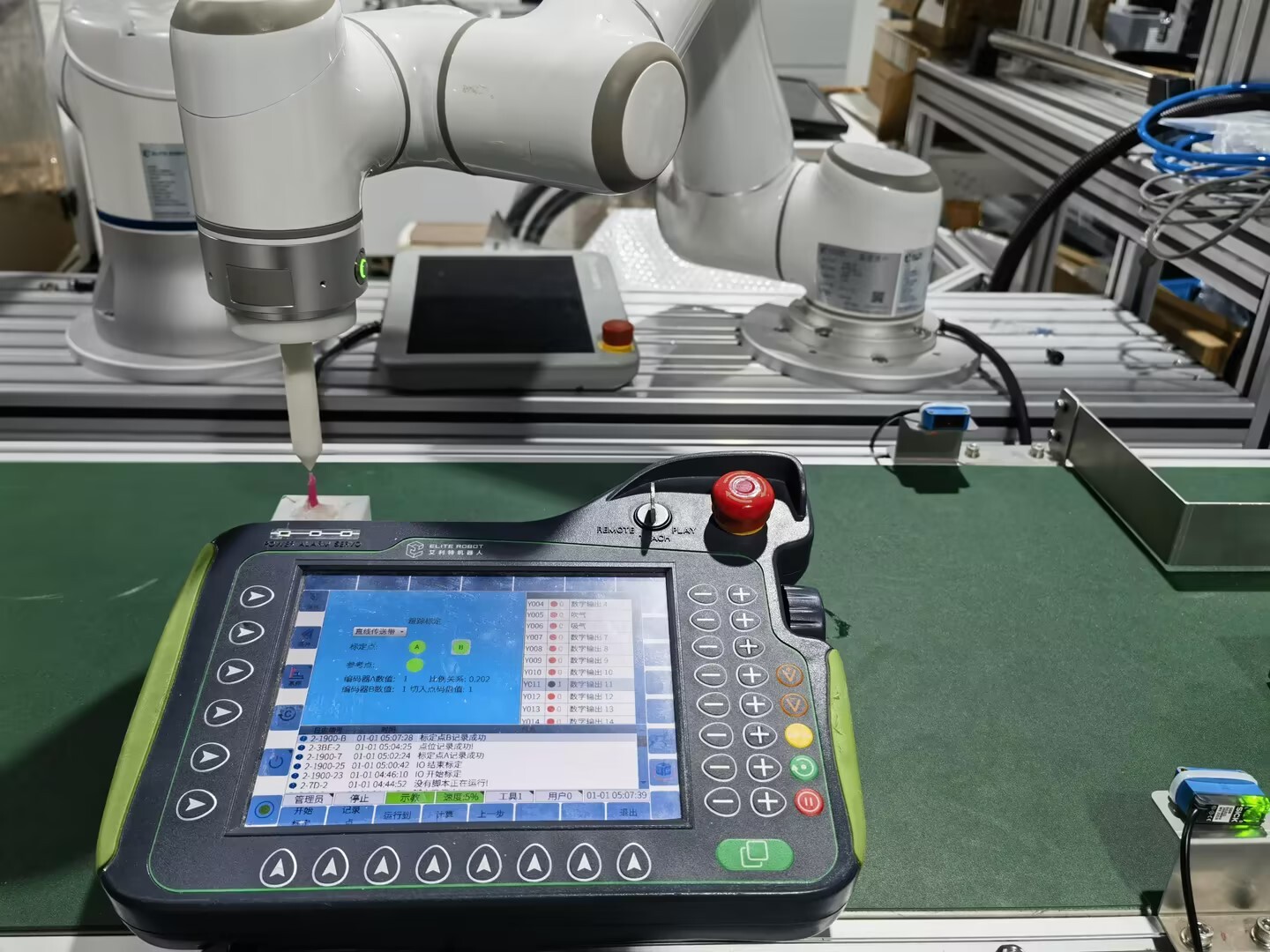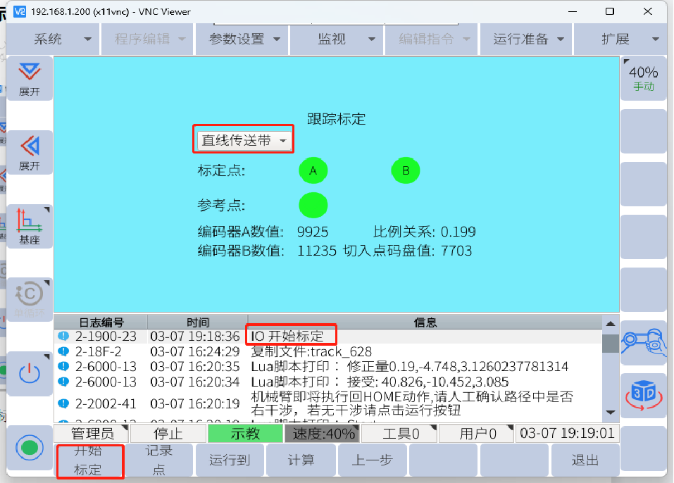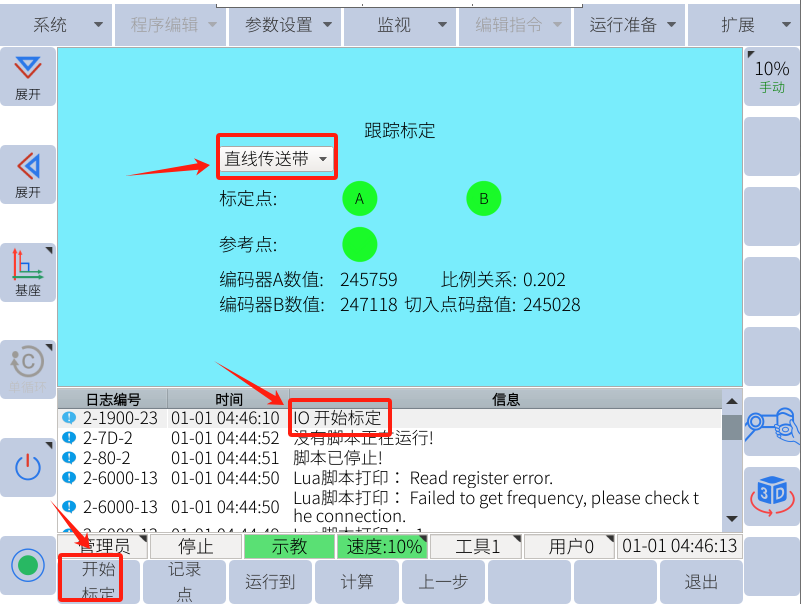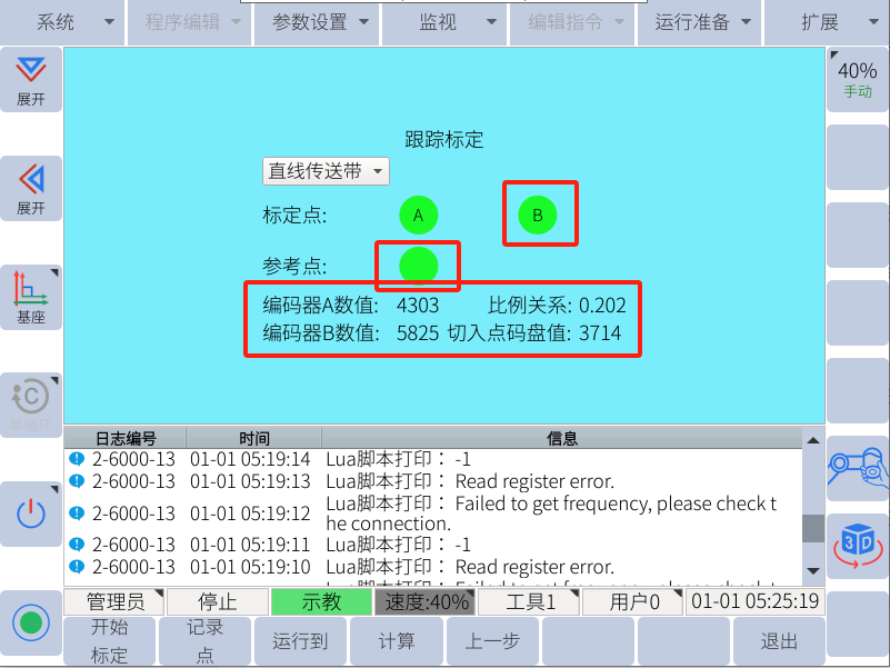 示教完跟蹤軌跡后將傳送帶緩慢開動一段距離后(設(shè)定的有效結(jié)束距離400mm以內(nèi),最優(yōu)300-350mm),停止傳送帶運動(傳送帶速度保持不變),將機械臂移動至B點并記錄B點(A點B點需戳向同一個特征點記錄),記錄A點和B點時,下面會顯示編碼器數(shù)值,