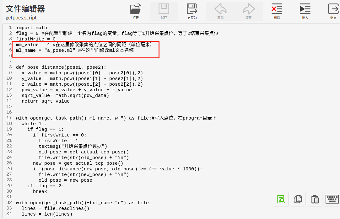 3.腳本說明:可在紅框處修改采集的點位間距和ml文件的名稱。