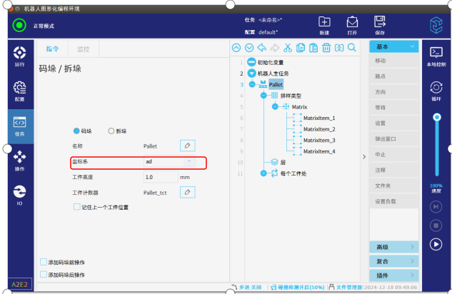 第一步:在機器人主任務里插入一個碼垛指令,坐標系選擇新建的用戶坐標系(如圖-2紅框標記處)。