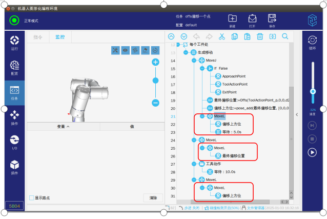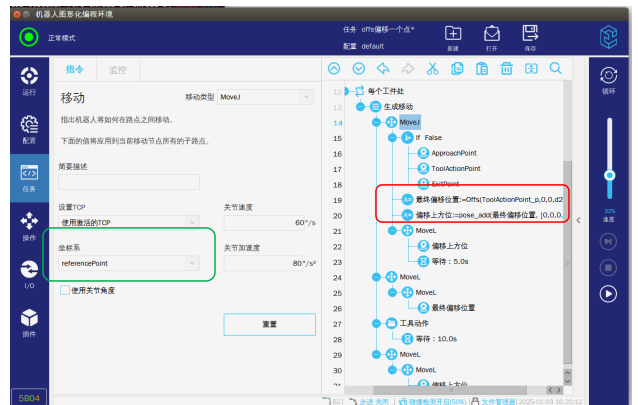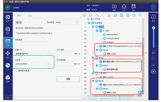 - 使用2.2(方法2)進行偏移時要重新插入一個movel運動指令,然后將偏移點位放在新插入的運動movel指令下(如圖-6和圖-9紅框標記所示)。