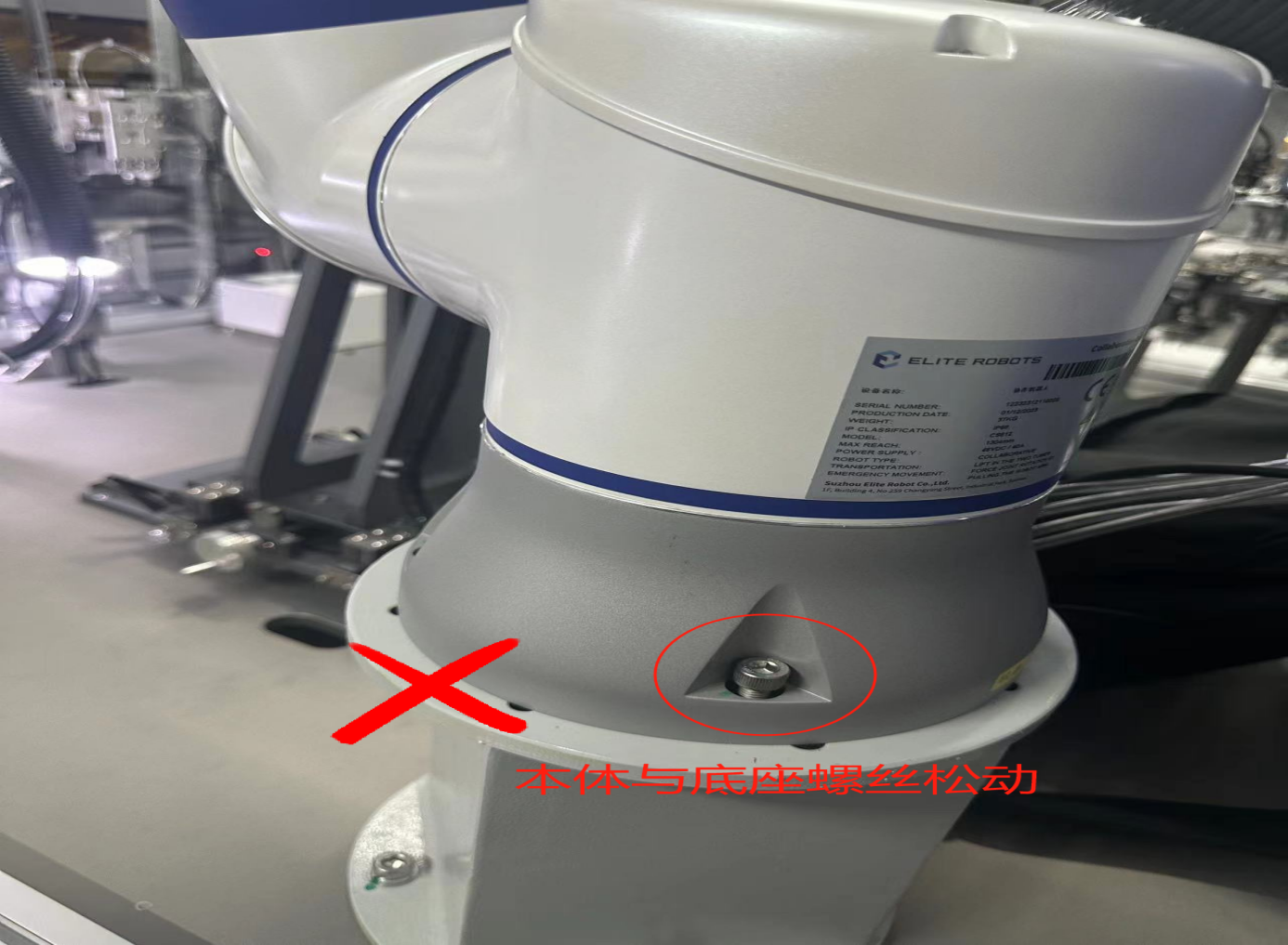 檢查機(jī)器人本體上的螺絲是否松動(dòng)或丟失、機(jī)器人末端的工具是否有松動(dòng),工作臺(tái)是否本身就抖動(dòng),機(jī)器人會(huì)因?yàn)檎饎?dòng)而對(duì)緊固件產(chǎn)生振動(dòng),長(zhǎng)時(shí)間運(yùn)動(dòng)后螺絲可能會(huì)松動(dòng)或者丟失,導(dǎo)致機(jī)器人抖動(dòng)。如圖2-1-1所示機(jī)器人本體與底座的螺絲松動(dòng)。
