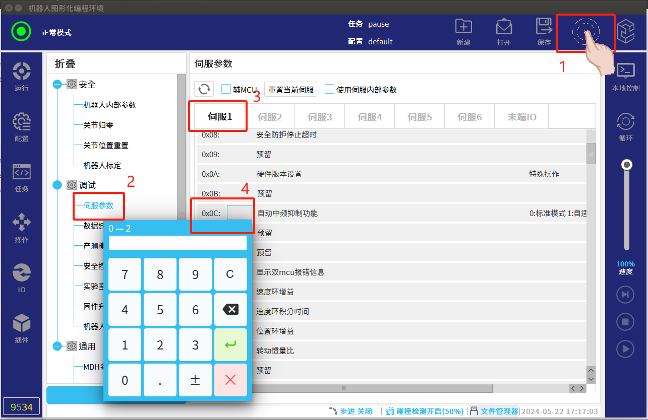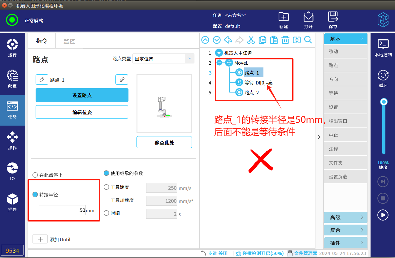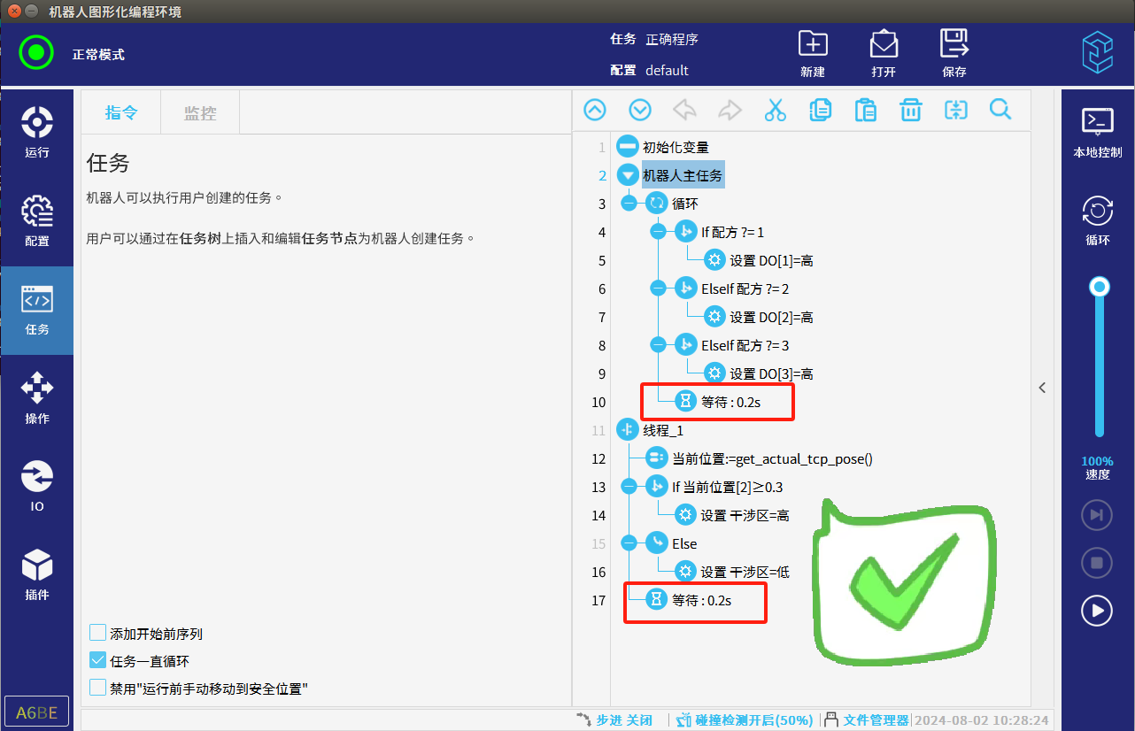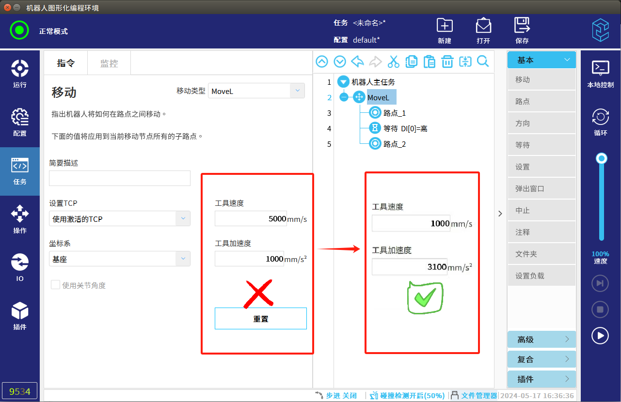 4.調(diào)試過程中速度盡量放慢,碰撞檢測(cè)要打開,避免發(fā)生碰撞機(jī)器人發(fā)生抖動(dòng)。