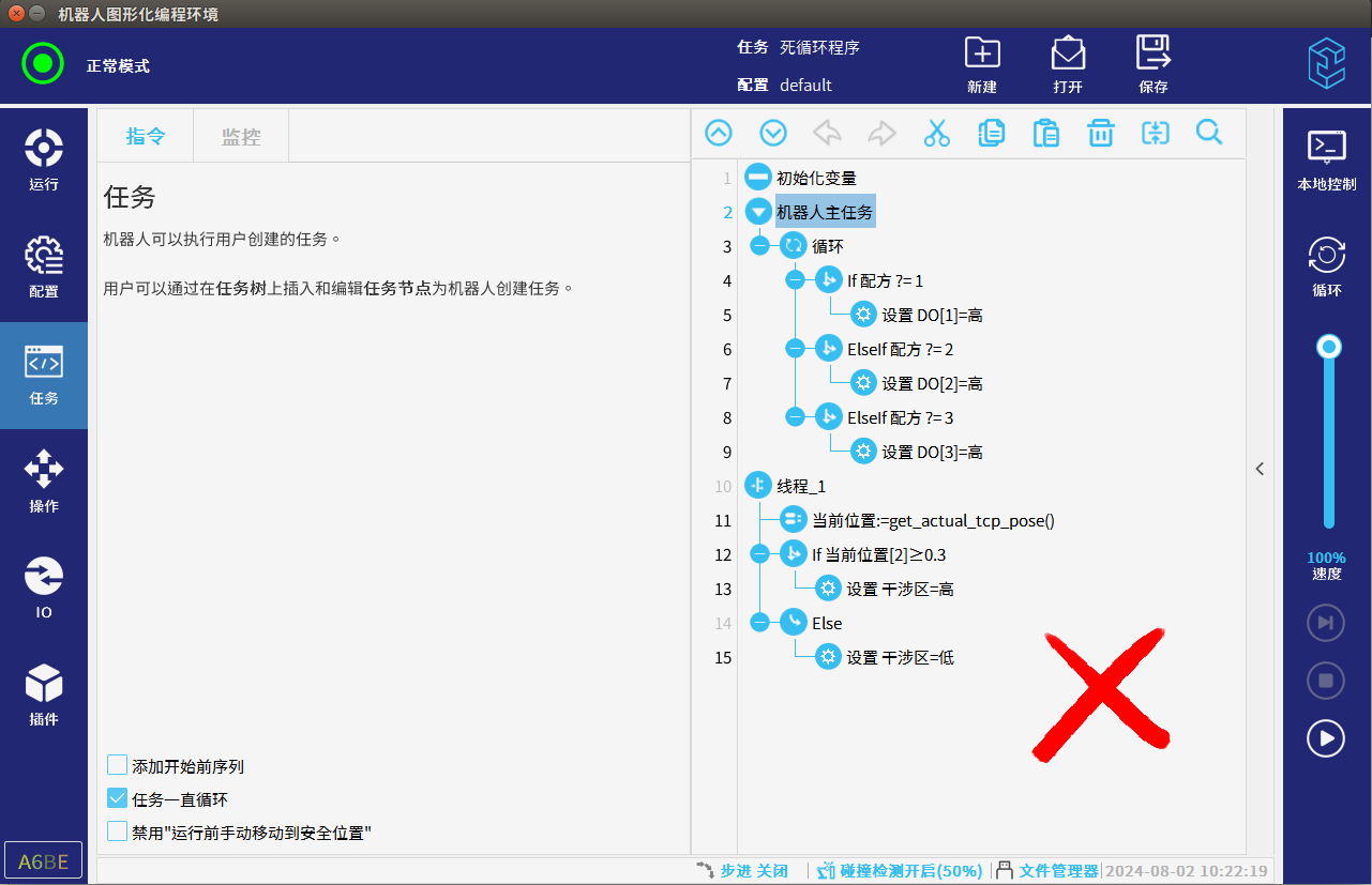 檢查程序中是否有死循環(huán)會(huì)導(dǎo)致機(jī)器人CUP過載,CPU過載也會(huì)導(dǎo)致機(jī)器人抖動(dòng),例如程序中一直if循環(huán)判斷且條件多次不滿足的時(shí)候程序會(huì)進(jìn)入死循環(huán),使用線程時(shí)線程中沒有加等待時(shí)間程序也會(huì)進(jìn)入死循環(huán)如圖3-2-1,應(yīng)該在循環(huán)/線程中加等待時(shí)間避免出現(xiàn)死循環(huán)CPU過載后導(dǎo)致機(jī)器人點(diǎn)到點(diǎn)抖動(dòng)如圖3-2-2所示。