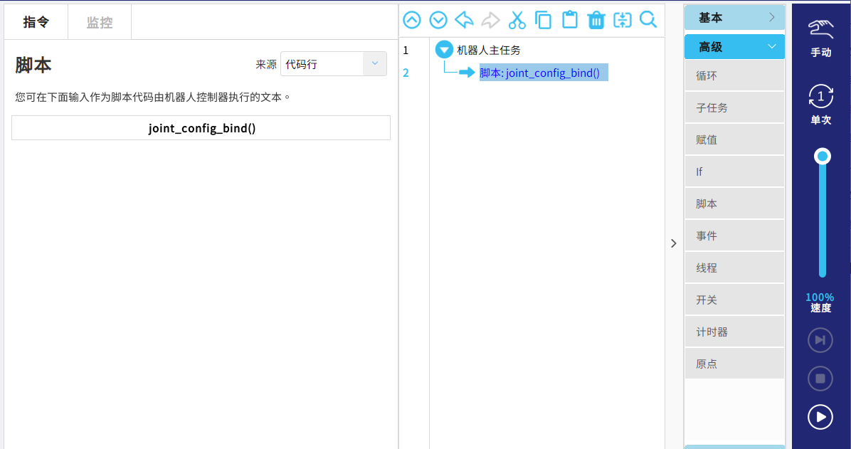在運(yùn)行了上述自適應(yīng)低頻抖動(dòng)抑制功能后,伺服會(huì)自動(dòng)學(xué)習(xí)一組合適的抑制振動(dòng)的參數(shù),此時(shí)需要單次執(zhí)行腳本 joint_config_bind()進(jìn)行數(shù)據(jù)保存,如圖4-2所示,腳本執(zhí)行完成后可以在 下位機(jī)中進(jìn)行查看,路徑為:/rbctrl/eli_robot_data/joint_bind.conf;