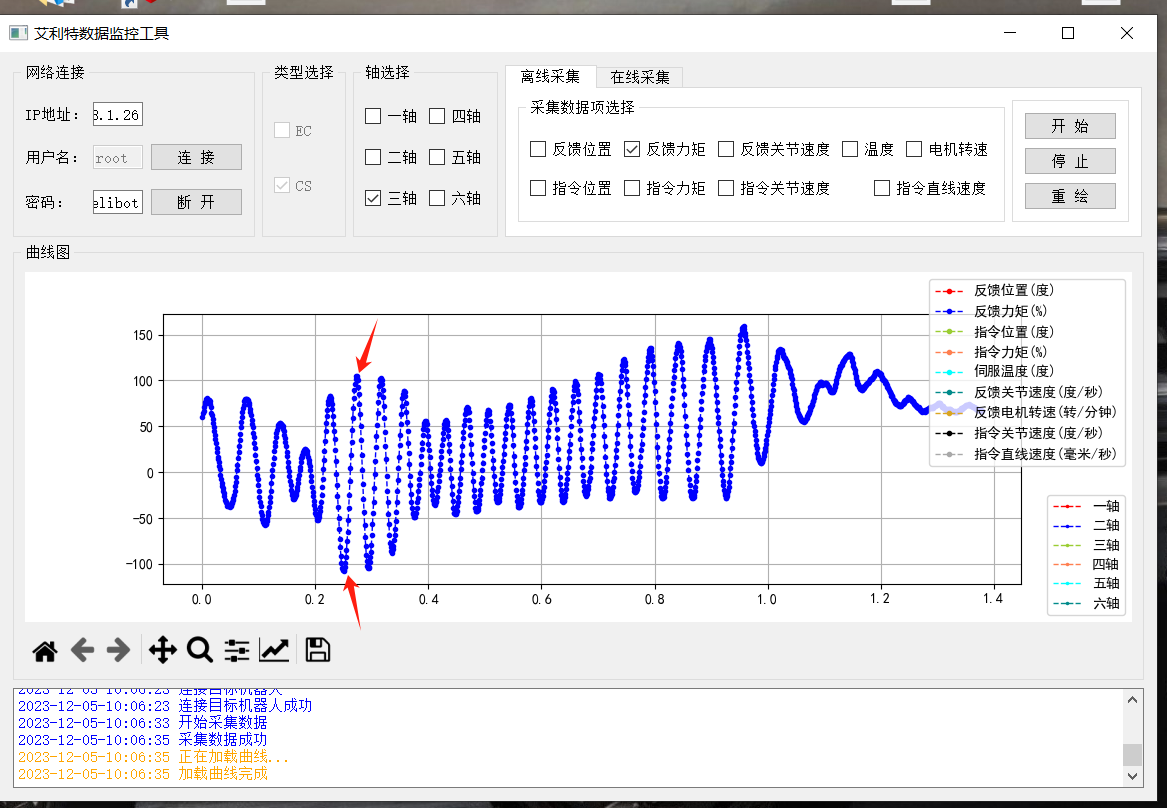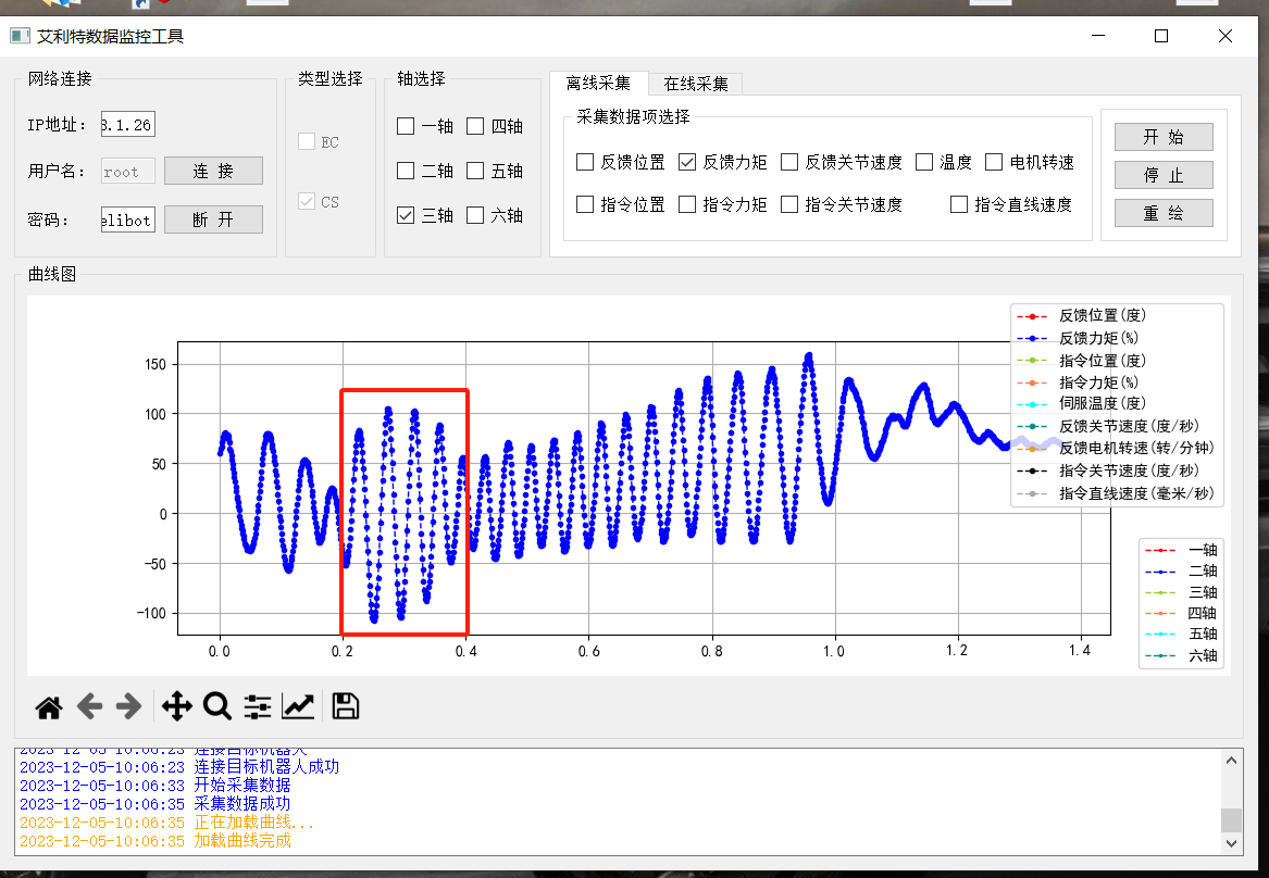 功能:其內(nèi)主要是對(duì)關(guān)節(jié)的力矩,速度等信息的采集,主要分四個(gè)區(qū):網(wǎng)絡(luò)連接區(qū),類型選擇區(qū),軸區(qū)以及采集區(qū)