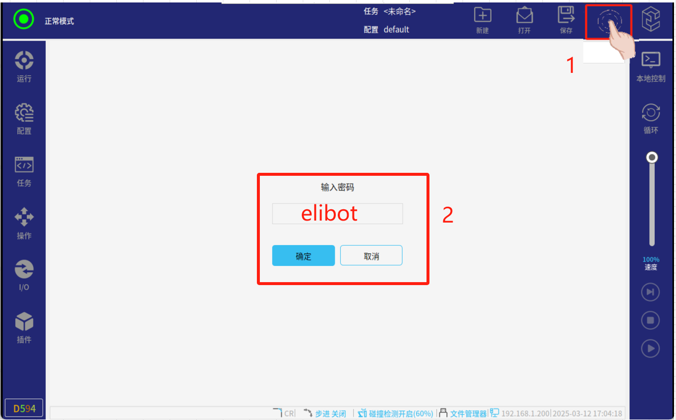 2、在正常模式下點(diǎn)擊如圖4-1所示右上角紅框標(biāo)注區(qū)域(連續(xù)快速點(diǎn)擊 5-8 次)就會(huì)出現(xiàn)輸入密碼頁面界,然后輸入密碼:elibot,進(jìn)入專家模式;