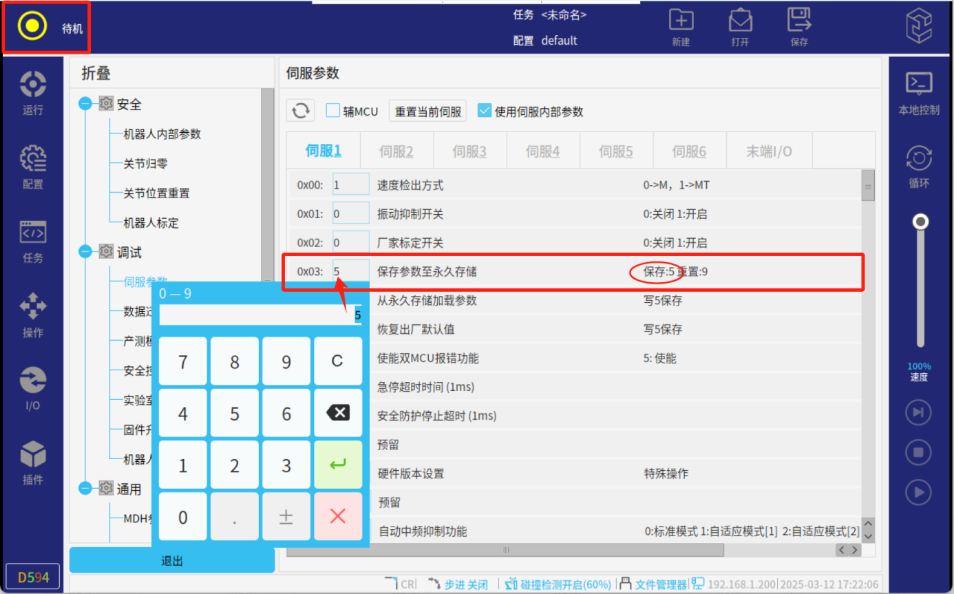 6、調(diào)整好參數(shù)后,需要保存至伺服,否則再次上電調(diào)整好的參數(shù)會(huì)丟失,Pn03參數(shù)寫入5進(jìn)行保存,機(jī)器人顯示待機(jī)狀態(tài)說明保存成功。