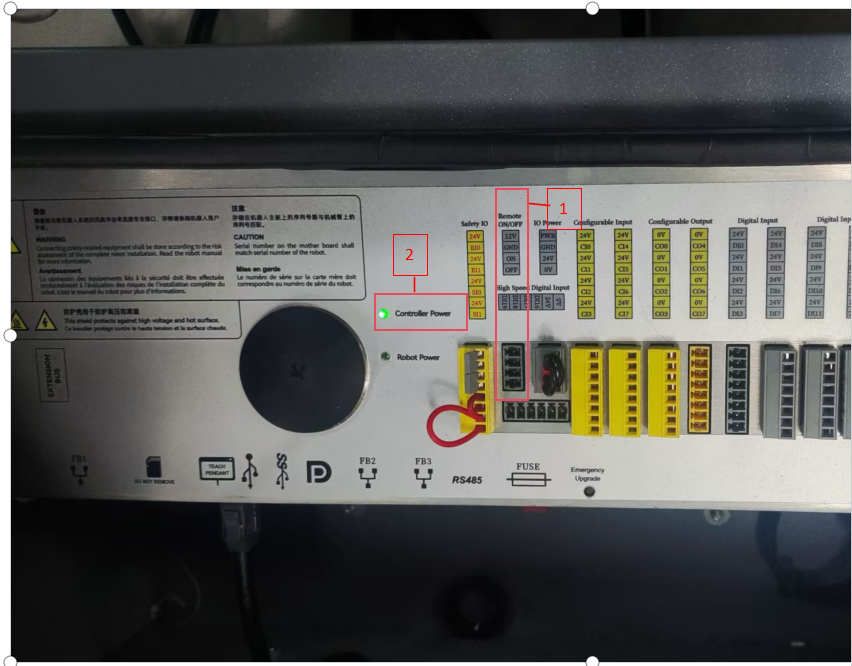 第二步:找到機器人控制柜遠程開關機端口,即圖-1第一處紅框標記處