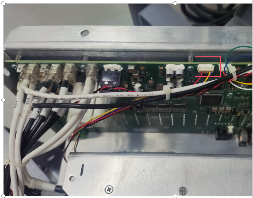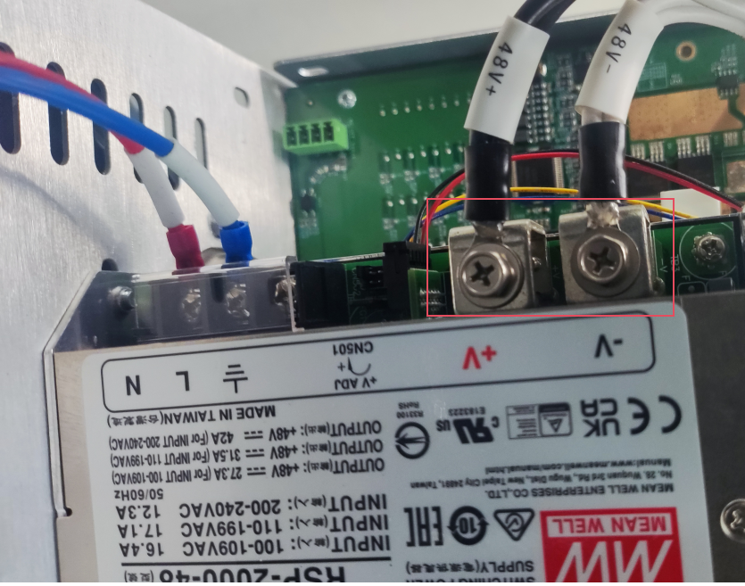 第二步:將機器人控制柜電源開關打開,將safeio板上啟動48V開關電源的線束拔掉,如圖-3紅框標記處,用萬用表測量是否有48V輸出,測量點如圖-4紅框標記處。如果有48V輸出,說明開關電源沒有問題,safeio板出現故障需要現場更換或者返廠維修;