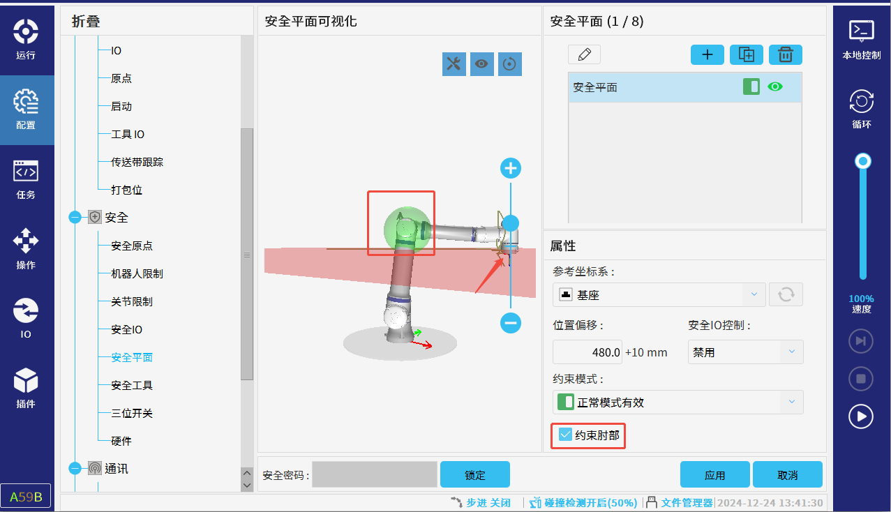 設置安全平面時可以選擇勾選或者不勾選“約束肘部”(勾選了會在肘部有個球體),如果勾選了則需要把肘部連同末端TCP一同脫離安全平面,如果沒有勾選則只需要把末端TCP脫離安全平面,操作方法如同2.1