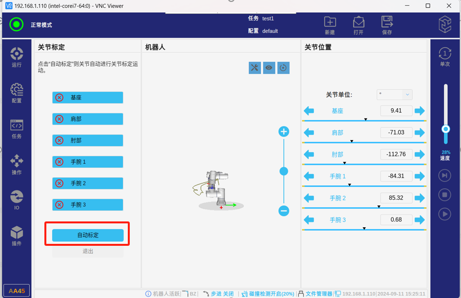 如需在本地模式下進行手動標定,即可在彈出自動標定頁面后,點擊自動標定按鈕進行標定,各軸會小范圍自動移動,完成后各軸為黃色狀態退出即可。
