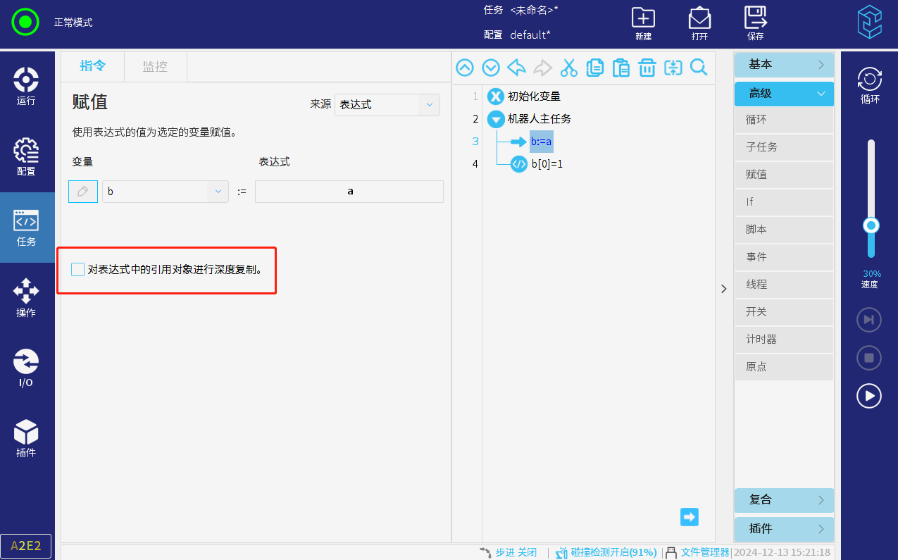 任務中添加下圖程序程序,將數組a賦值給數組b,再修改b數組的值,勾選深度賦值